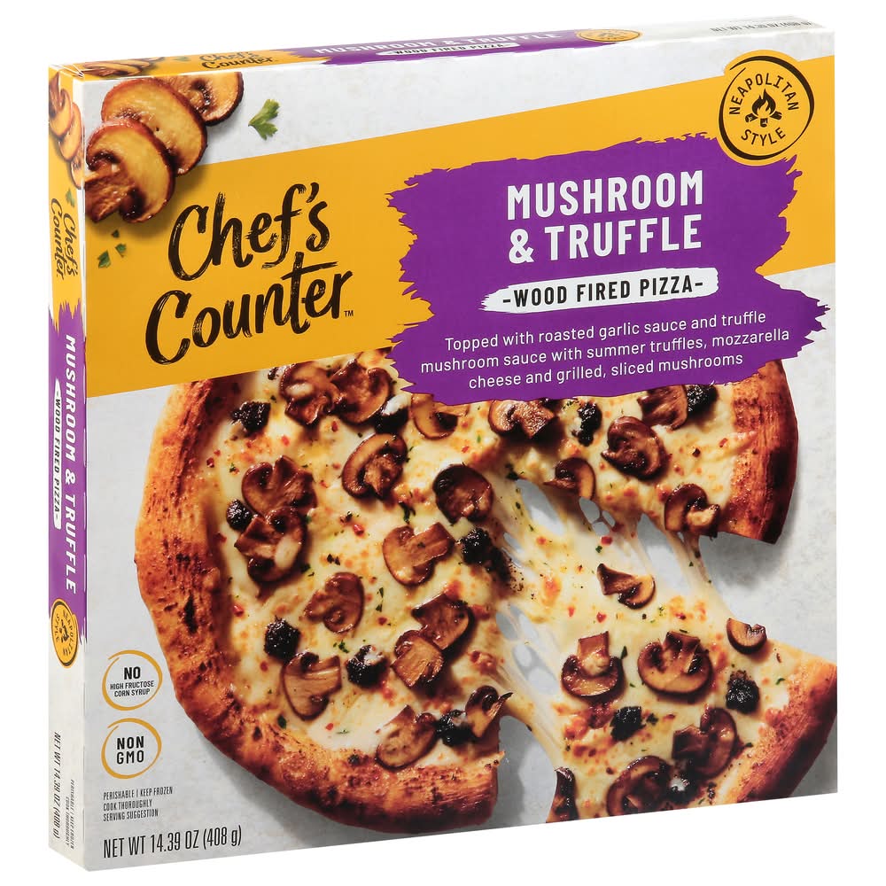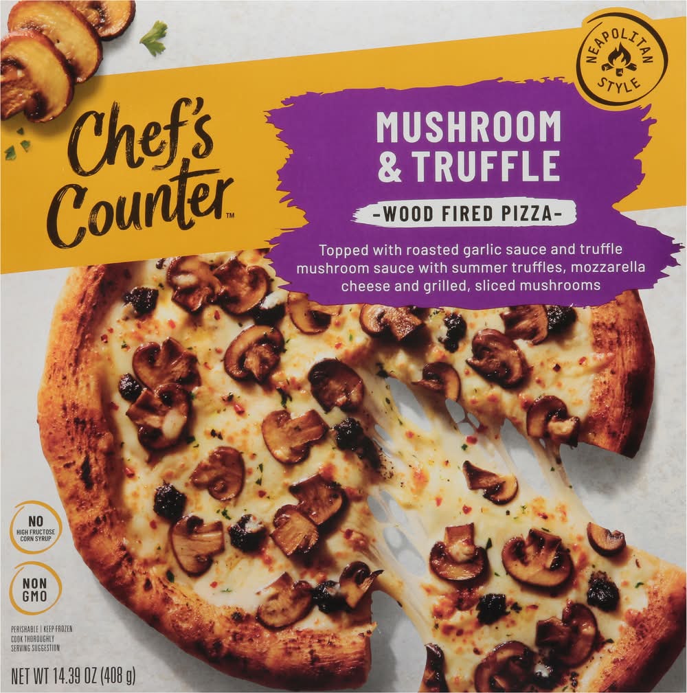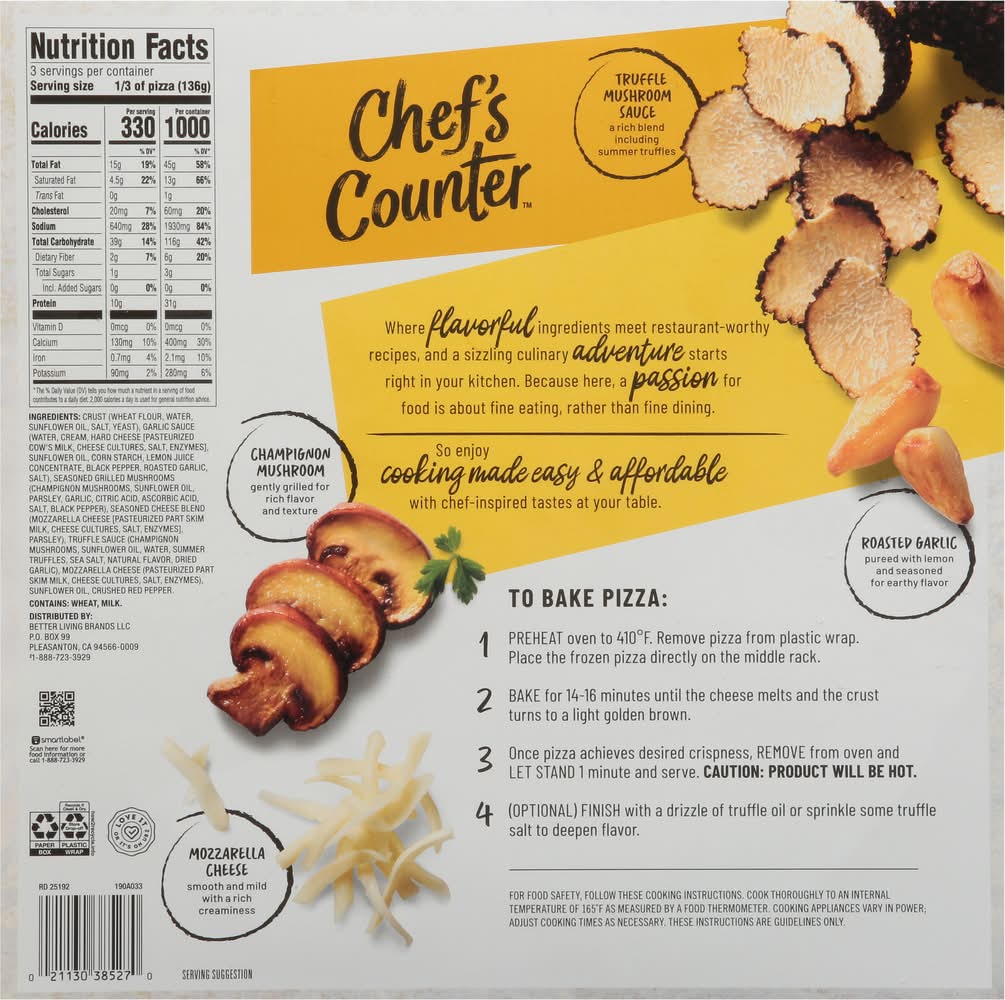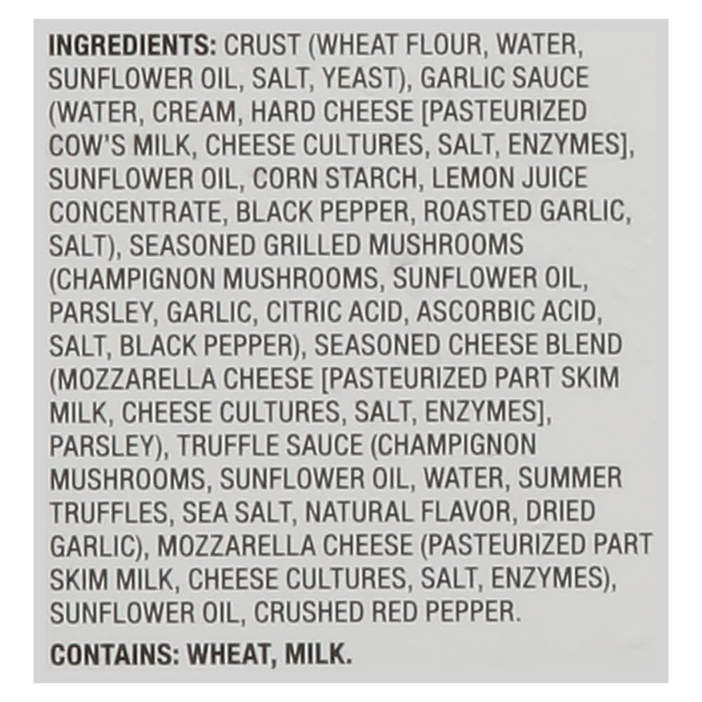 Ingredients: Crust (Wheat Flour, Water, Sunflower Oil, Salt, Yeast), Garlic Sauce (Water, Cream, Hard Cheese [Pasteurized Cow's Milk, Cheese Cultures, Salt, Enzymes], Sunflower Oil, Corn Starch, Lemon Juice Concentrate, Black Pepper, Roasted Garlic, Salt), Seasoned Grilled Mushrooms (Champignon Mushrooms, Sunflower Oil, Parsley, Garlic, Citric Acid, Ascorbic Acid, Salt, Black Pepper), Seasoned Cheese Blend (Mozzarella Cheese [Pasteurized Part Skim Milk, Cheese Cultures, Salt, Enzymes], Parsley), Truffle Sauce (Champignon Mushrooms, Sunflower Oil, Water, Summer Truffles, Sea Salt, Natural Flavor, Dried Garlic), Mozzarella Cheese (Pasteurized Part Skim Milk, Cheese Cultures, Salt, Enzymes), Sunflower Oil, Crushed Red Pepper Contains: Wheat, Milk