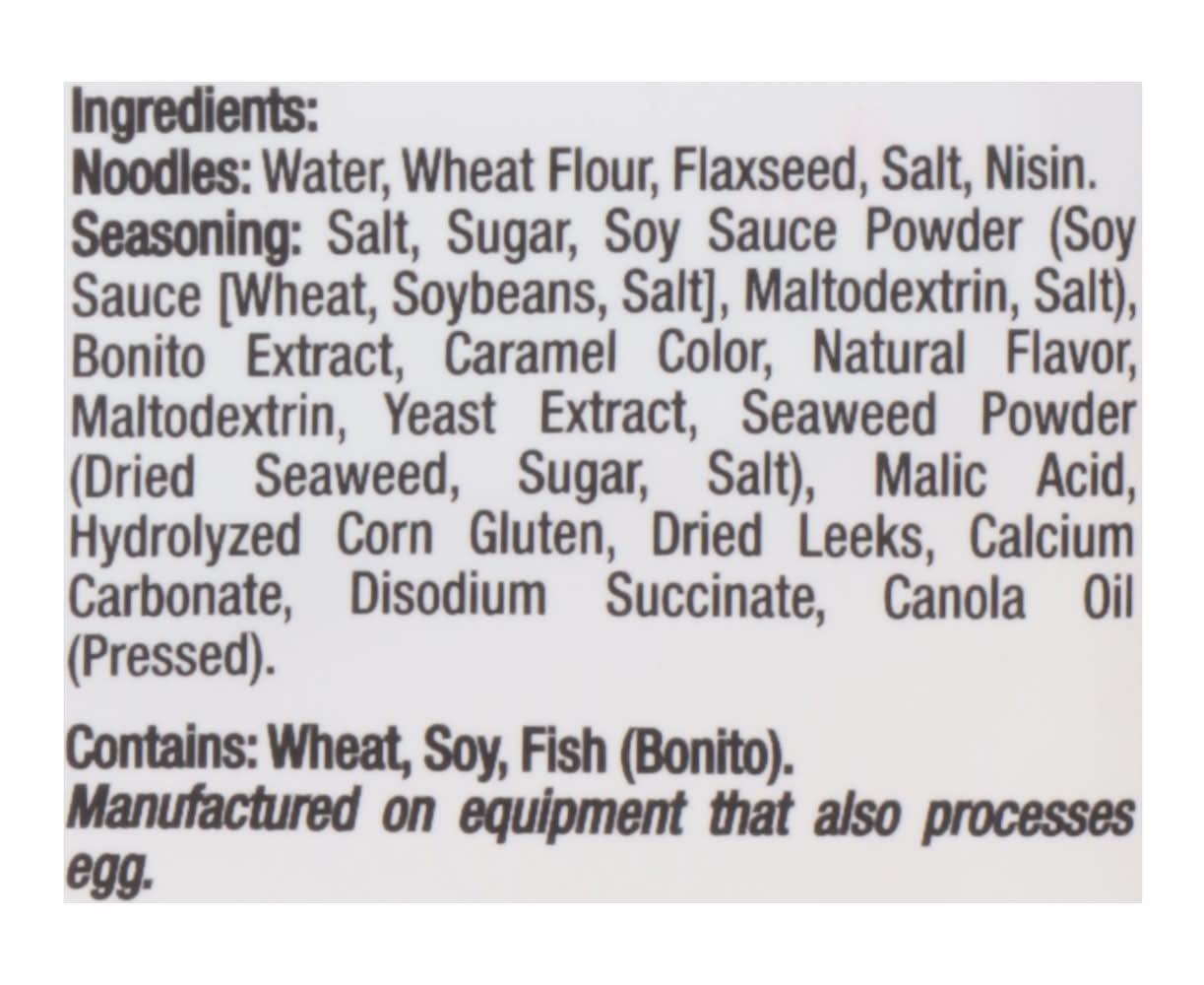 Ingredients: Noodles: Water, Wheat Flour, Flaxseed, Salt, Nisin. Seasoning: Salt, Sugar, Soy Sauce Powder (Soy Sauce [Wheat, Soybeans, Salt], Maltodextrin, Salt), Bonito Extract, Caramel Color, Natural Flavor, Maltodextrin, Yeast Extract, Seaweed Powder (Dried Seaweed, Sugar, Salt), Malic Acid, Hydrolyzed Corn Gluten, Dried Leeks, Calcium Carbonate, Disodium Succinate, Canola Oil (Pressed) Contains: Wheat, Soybeans, Fish, Bonito, Gluten, Eggs