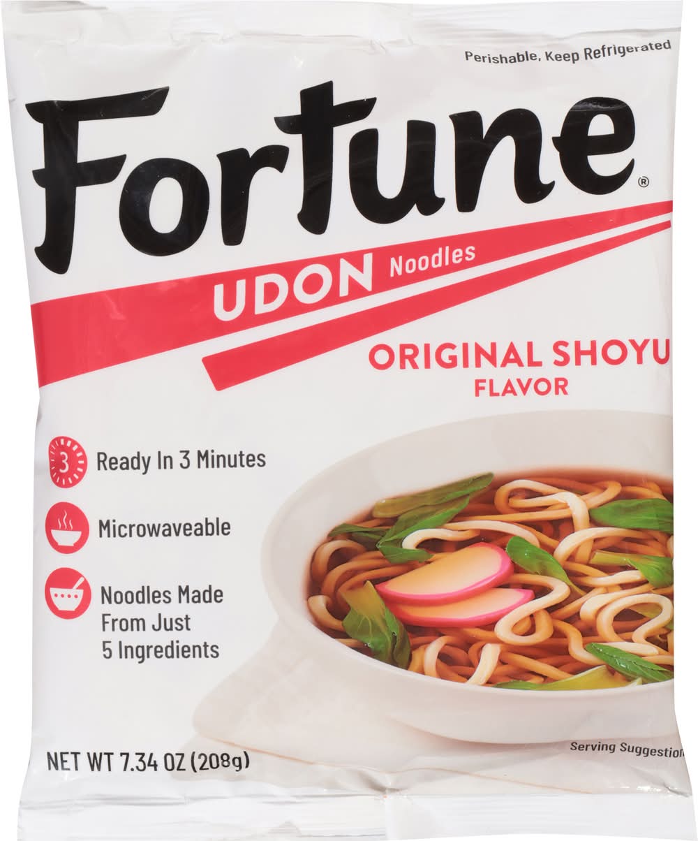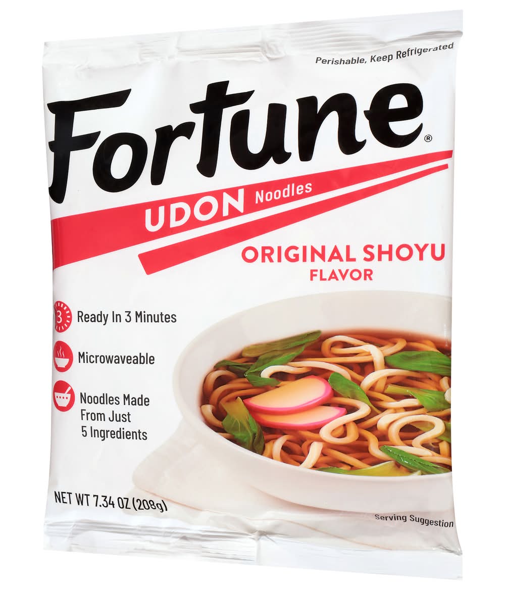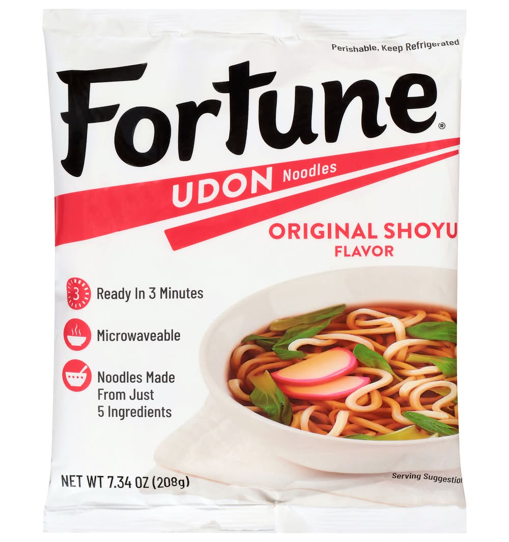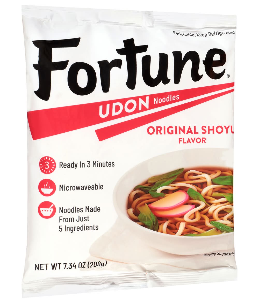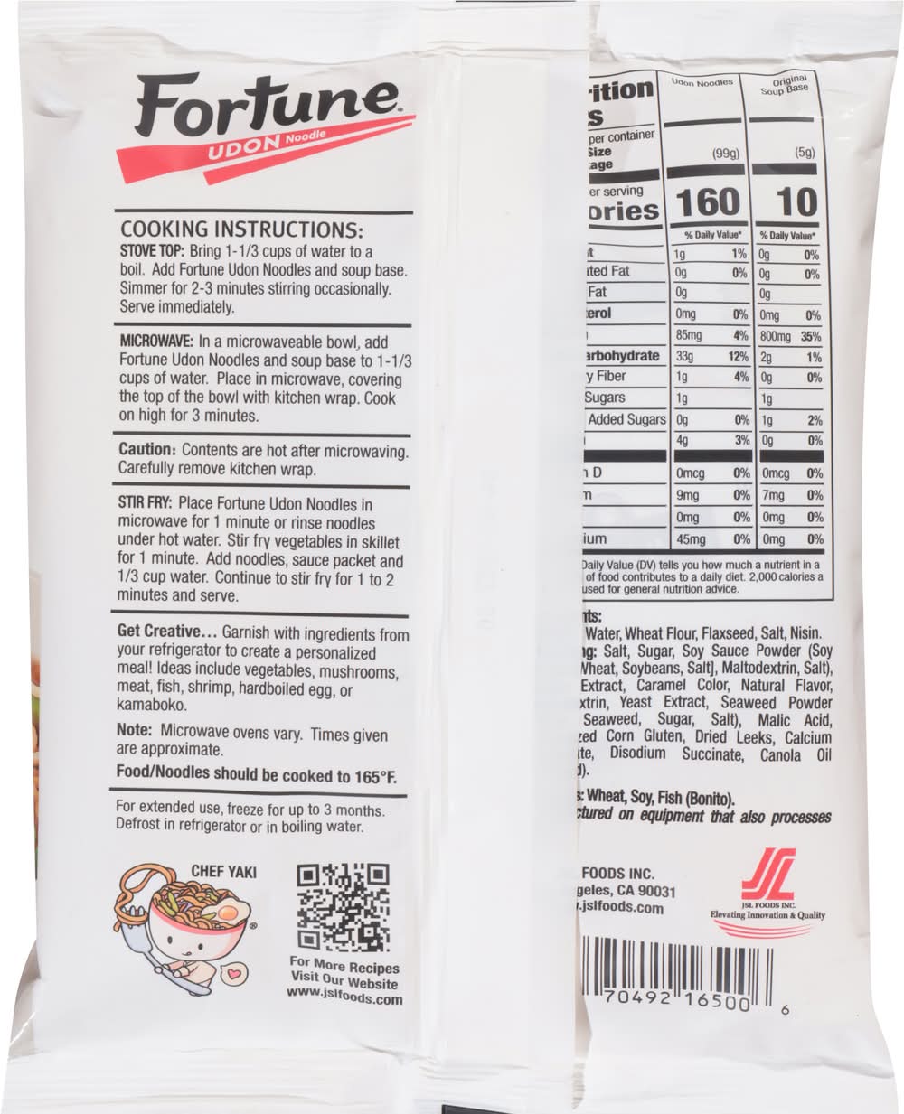 Directions for use: Pre-cooked. Ready to cook. Microwaveable. Cooking Instructions: Stove Top: Bring 1-1/3 cup of water to a boil. Add fortune Udon noodles and soup base. Simmer for 2-3 minutes stirring occasionally. Server immediately. Microwave: In a microwaveable bowl, add Fortune Udon Noodles and soup base to 1-1/3 cup of water. Place in microwave, covering the top of the bowl with kitchen wrap. Cook on high for 3 minutes. Caution: Contents are hot after microwaving. Carefully remove kitchen wrap. Stir Fry: Place Fortune Udon Noodles in microwave for 1 minute or rinse noodles under hot water. Stir fry vegetables in skillet for 1 minute. Add noodles, sauce packet and 1/3 cup water. Continue to stir fry for 1 to 2 minutes and serve. Note: Microwave ovens vary. Times given are approximate. Food/Noodles should be cooked to 165 degrees F. For extended use, freeze for up to 3 months. Defrost in refrigerator or in boiling water. Get Creative: Garnish with ingredients from your refrigerator to create a personalized meal! Ideas include vegetables, mushrooms, meat, fish, shrimp, hardboiled egg, or kamaboko. Keep refrigerated, perishable. Storage recommendation: Keep refrigerated, perishable.