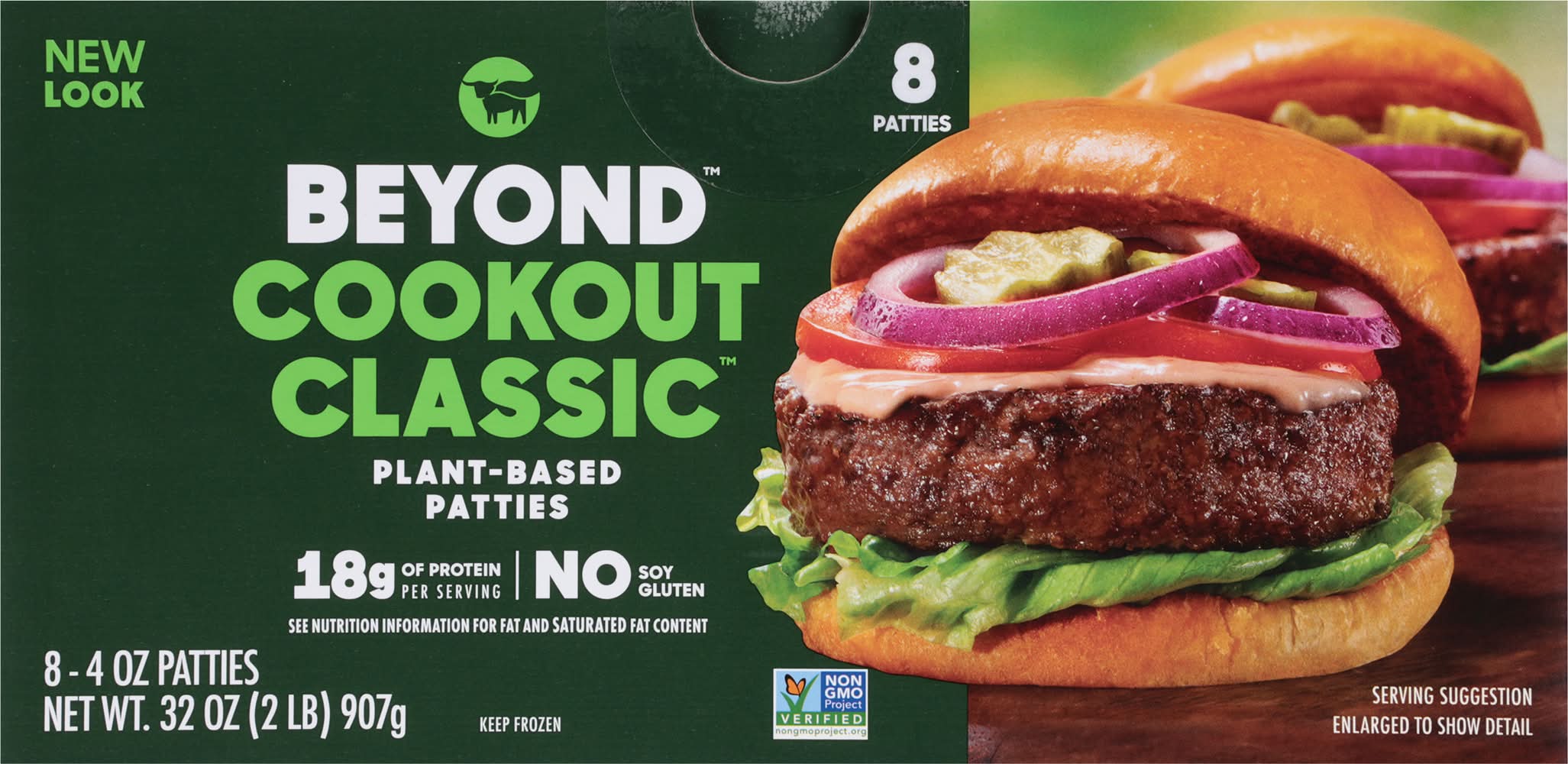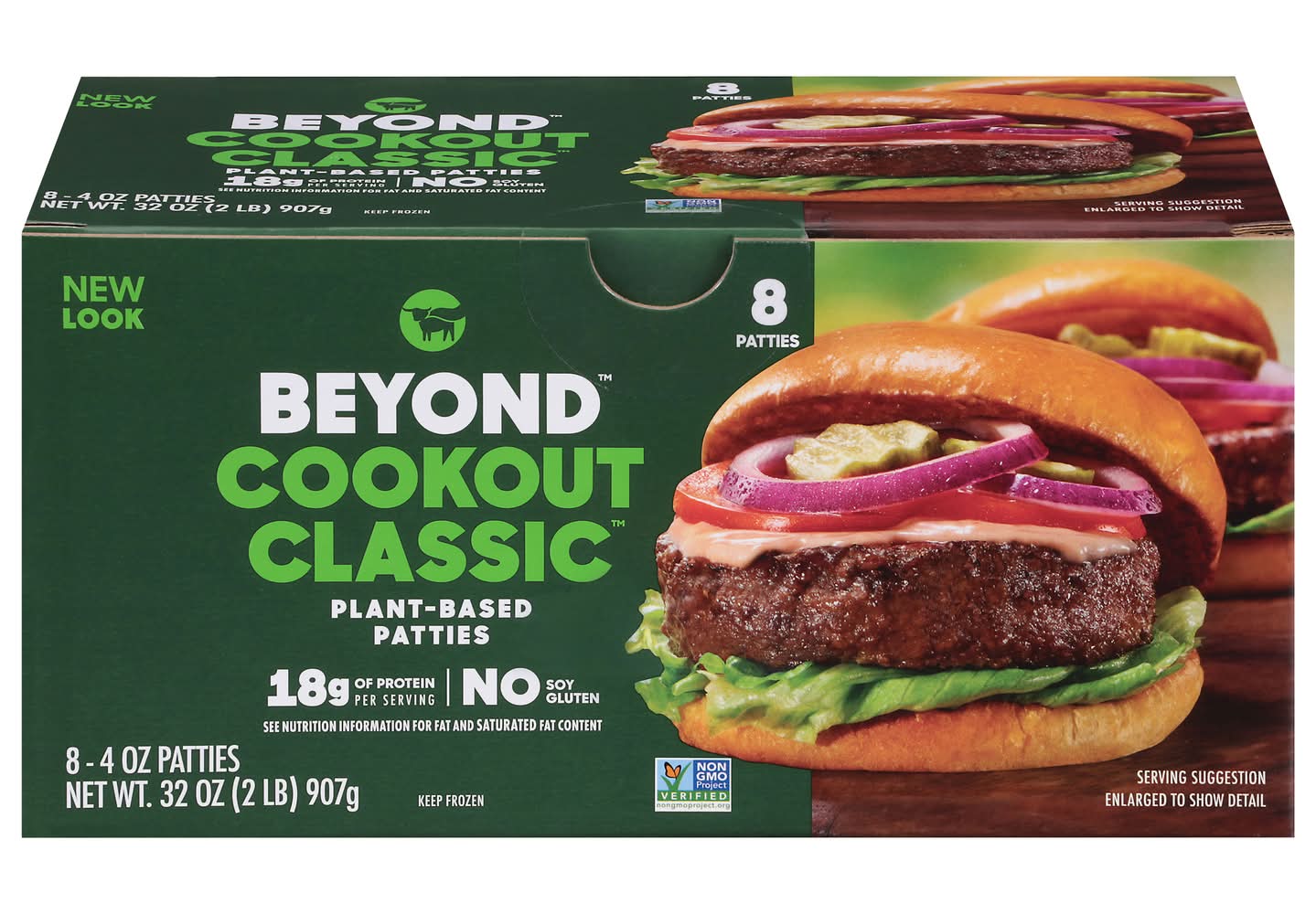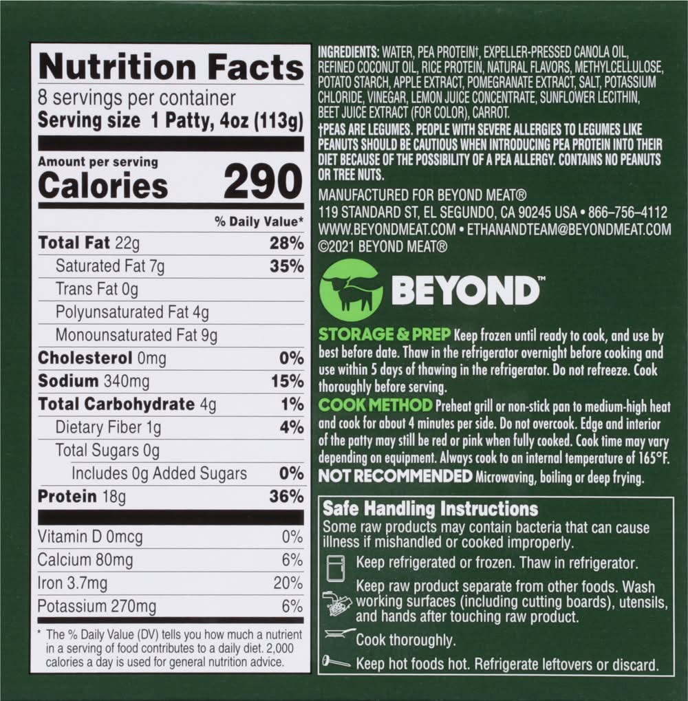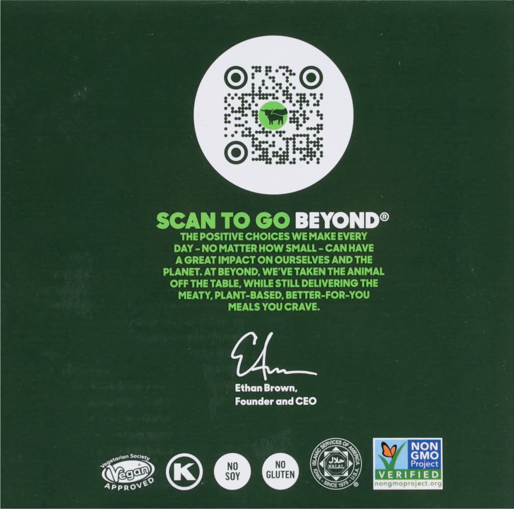 18 g of protein per serving. No gluten. Vegetarian Society: Approved: Vegan. No gluten. Halal. See nutrition information for fat and saturated fat content. No soy. Non-GMO Project verified. Beyond: The positive choices we make every day - no matter how small - can have a great impact on ourselves and the planet. At Beyond, we've taken the animal off the table, while still delivering the meaty, plant-based, better-for-you meals you crave. - Ethan Brown, Founder and CEO. • Pack size: 8 • Packaging: Reusable