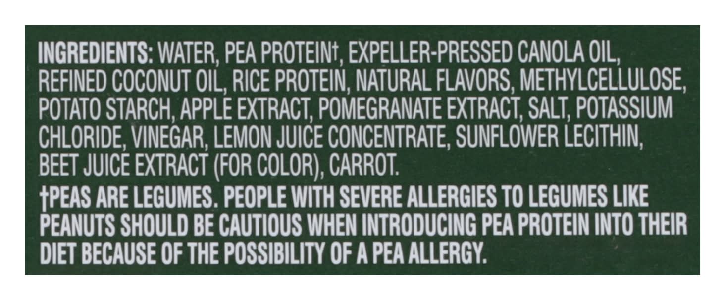 Ingredients: Water, Pea Protein (Peas are Legumes, People with Severe Allergies to Legumes Like Peanuts Should be Cautious When Introducing Pea Protein Into their Diet Because of the Possibility of a Pea Allergy. Contains no Peanuts or Tree Nuts), Expeller-Pressed Canola Oil, Refined Coconut Oil, Rice Protein, Natural Flavors, Methylcellulose, Potato Starch, Apple Extract, Pomegranate Extract, Salt, Potassium Chloride, Vinegar, Lemon Juice Concentrate, Sunflower Lecithin, Beet Juice Extract (or Color), Carrot Contains: Tree Nuts, Coconuts