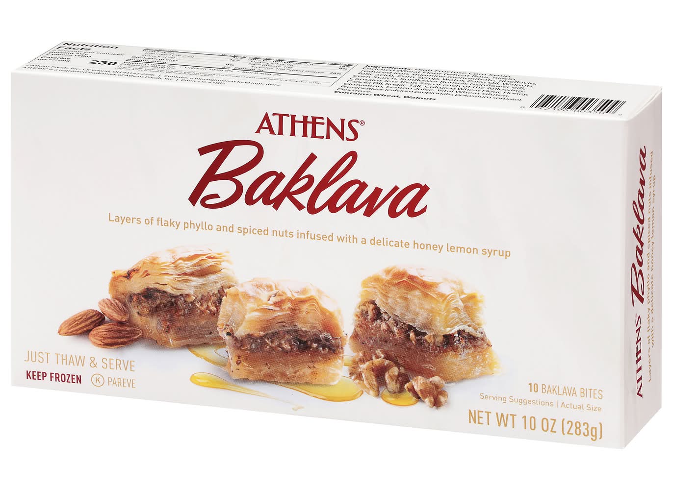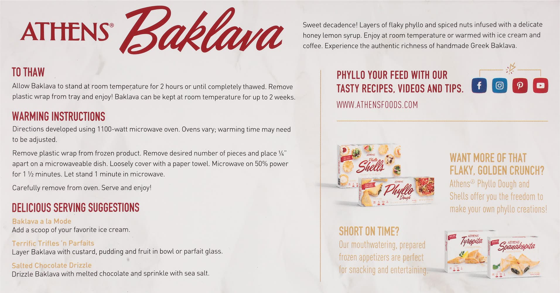 Directions: keep frozen. thawing: remove plastic wrap from tray. allow baklava to stand at room temperature for 2 hours or until completely thawed. baklava can be kept at room temperature for up to 2 weeks. delicious baklava serving ideas: baklava a la mode: add a scoop of your favorite ice cream. elegant strawberry shortcake: serve baklava with fresh, sliced strawberries and whipped cream. peach melba supreme: place baklava square in peach-half; serve with raspberry sauce and whipped cream. terrific trifles 'n parfaits: layer baklava with custard, pudding and fruit in bowl or parfait glass.