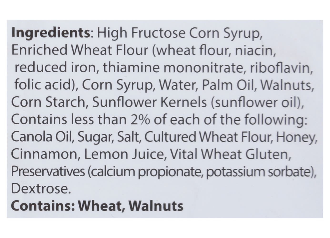 Ingredients: High Fructose Corn Syrup, Enriched Wheat Flour (Wheat Flour, Niacin, Reduced Iron, Thiamine Mononitrate, Riboflavin, Folic Acid), Corn Syrup, Water, Palm Oil, Walnuts, Corn Starch, Sunflower Kernels (Sunflower Oil), Contains Less than 2% of Each of the Following: Canola Oil, Sugar, Salt, Cultured Wheat Flour, Honey, Cinnamon, Lemon Juice, Vital Wheat Gluten, Preservatives (Calcium Propionate, Potassium Sorbate), Dextrose Contains: Corn, Wheat, Tree Nuts, Walnuts/Butternuts, Gluten