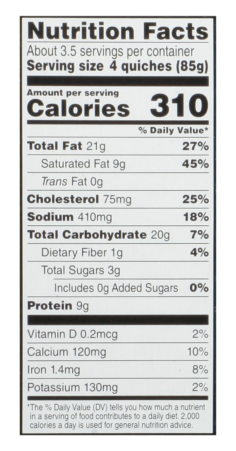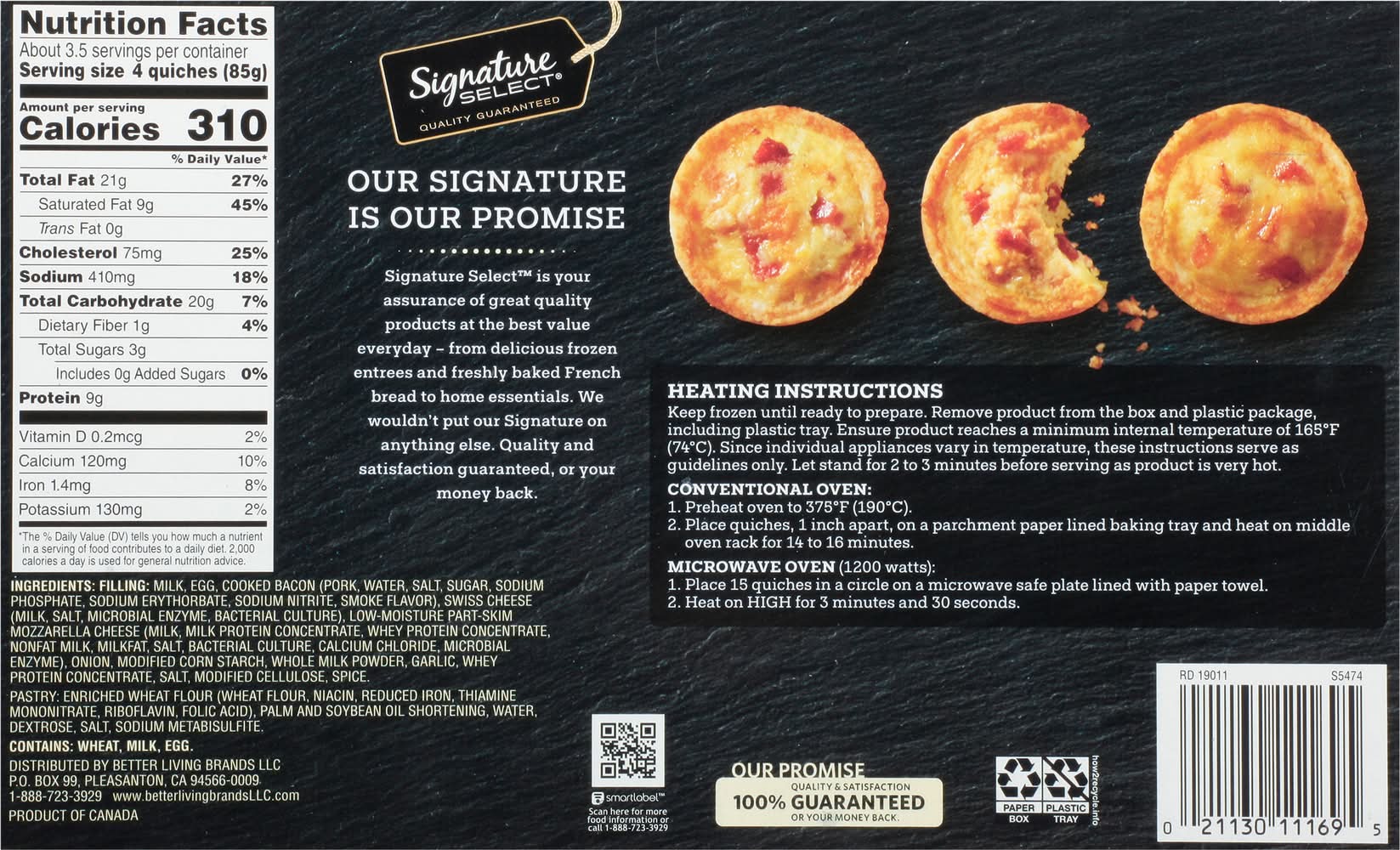 Egg, cheese, bacon and onions baked in a flaky pastry. Per 4 Quiches: 310 calories; 9 g sat fat (45% DV); 410 mg sodium (18% DV); 3 g total sugars. Quality guaranteed. Our signature is our promise. Signature Select is your assurance of great quality products at the best value entrees and freshly baked French bread to home essentials. We wouldn't put our Signature and satisfaction guaranteed, or your money back. Our Promise: Quality & satisfaction 100 guaranteed or your money back. www.betterlivingbrandsLLC.com. how2recycle.info. SmartLabel: Scan for more food information or call 1-888-723-3929. Product of Canada. • Number of servings: 3 • Packaging: Reusable