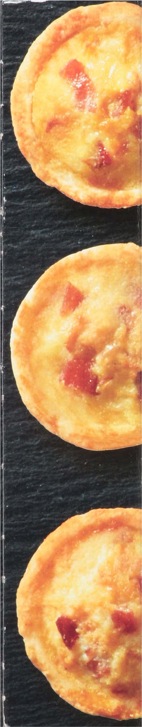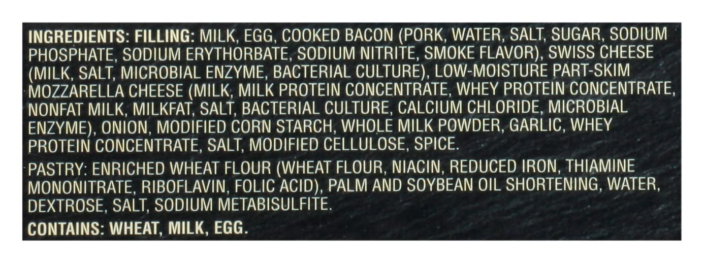 Ingredients: Filling: Milk, Egg, Cooked Bacon (Pork, Water, Salt, Sugar, Sodium Phosphate, Sodium Erythorbate, Sodium Nitrite, Smoke Flavor), Swiss Cheese (Milk, Salt, Microbial Enzyme, Bacterial Culture), Low-Moisture Part-Skim Mozzarella Cheese (Milk, Milk Protein Concentrate, Whey Protein Concentrate, Nonfat Milk, Milkfat, Salt, Bacterial Culture, Calcium Chloride, Microbial Enzyme), Onion, Modified Corn Starch, Whole Milk Powder, Garlic, Whey Protein Concentrate, Salt, Modified Cellulose, Spice. Pastry: Enriched Wheat Flour (Wheat Flour, Niacin, Reduced Iron, Thiamine Mononitrate, Riboflavin, Folic Acid), Palm and Soybean Oil Shortening, Water, Dextrose, Salt, Sodium Metabisulfite. Contains: Wheat, Milk, Eggs, Soybeans