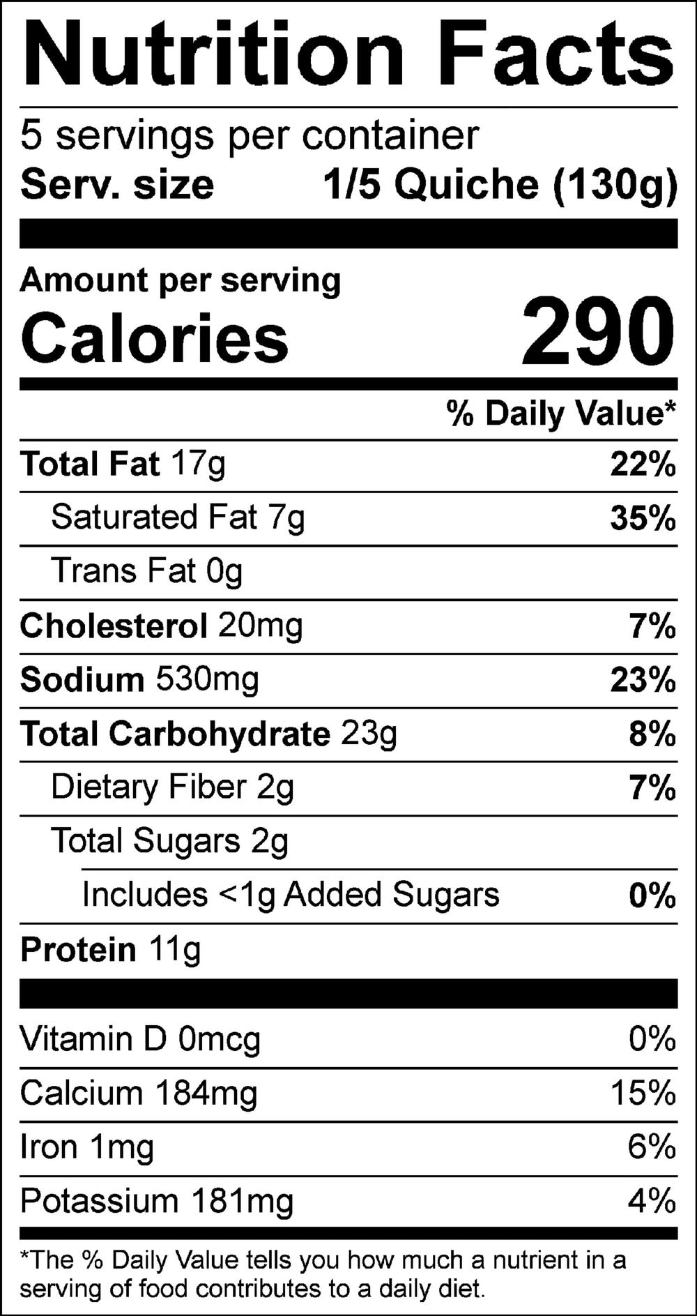 Directions for use: Directions: Cooking Instructions: Keep refrigerated or frozen until ready to cook (may freeze before best by date for up to one year from date of manufacture). Remove quiche from carton and plastic wrapping prior to cooking. Conventional Oven: (Preferred method) Preheat oven to 375 degrees F. Bake in foil pan for 25-28 minutes (add 10 minutes if frozen) or until center reaches 165 degrees F. Carefully remove from oven and set aside for 5 minutes. Microwave Oven: Cut into serving portions and place one serving on a microwave safe dish. Heat on high for 2 minutes or until center of the quiche reaches 165 degrees F. Let stand 5 minutes before serving. Storage recommendation: Perishable - Keep refrigerated. Previously frozen.
