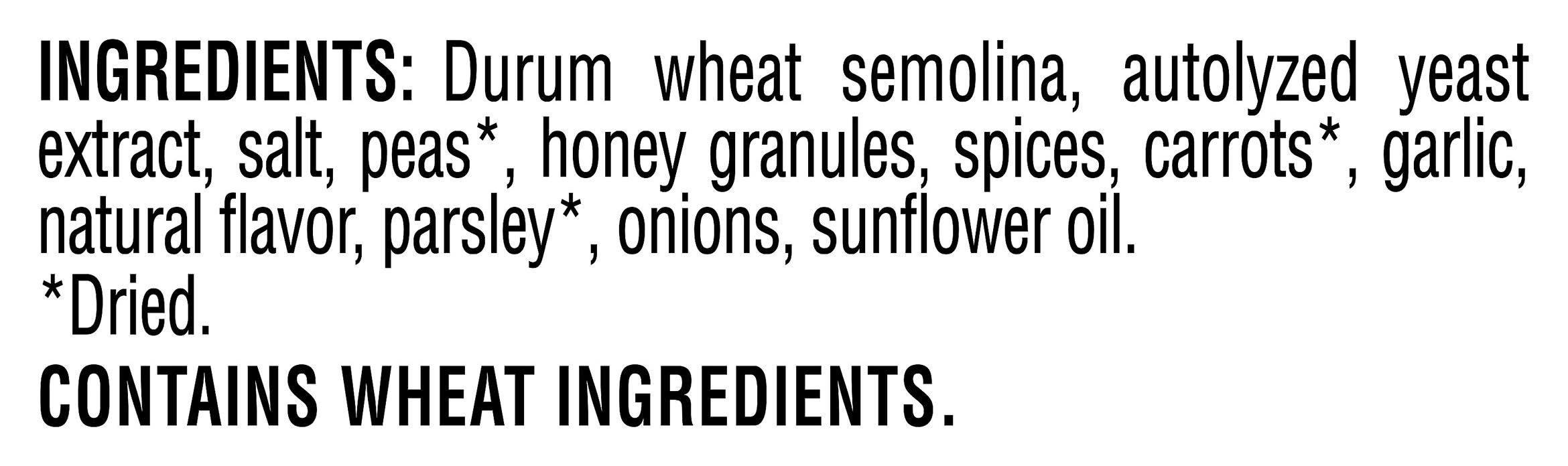 Ingredients: Durum Wheat Semolina, Autolyzed Yeast Extract, Salt, Peas (Dried), Honey Granules, Spices, Carrots (Dried), Garlic, Natural Flavor, Parsley (Dried), Onions, Sunflower Oil Contains: Wheat