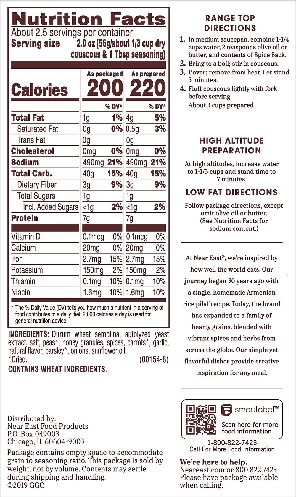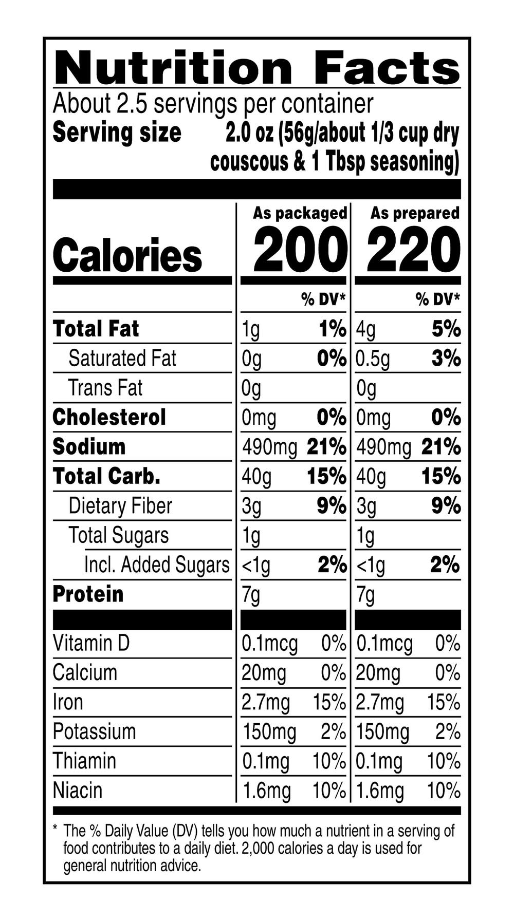 Cooks in 5 minutes. range top directions: (1) in medium saucepan, combine 1-1/4 cups water, 2 teaspoons olive oil or butter, and contents of spice sack. (2) bring to a boil; stir in couscous. (3) cover; remove from heat. let stand 5 minutes. (4) fluff couscous lightly with fork before serving. about 3 cups prepared. high altitude preparation: at high altitudes, increase water 1-1/3 cups and stand time to 7 minutes. low fat directions: follow package directions, except omit olive oil or butter. (see nutrition facts for sodium content.) microwave directions: (1) in round 2-quart microwaveable glass casserole, combine 1-1/4 cups water, 2 teaspoons olive oil or butter, and contents of spice sack. (2) cover; microwave at high 5 to 6 minutes or until boiling (microwave ovens may vary. adjust time as needed). (3) stir in couscous; cover. let stand 5 minutes. (4) fluff couscous lightly with fork before serving.
