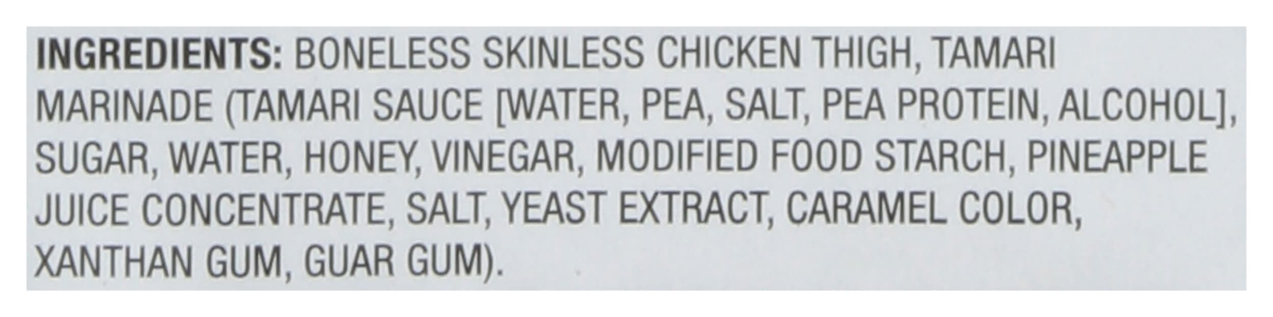 Ingredients: Boneless Skinless Chicken Thigh, Tamari Marinade (Tamari Sauce [Water, Pea, Salt, Pea Protein, Alcohol], Sugar, Water, Honey, Vinegar, Modified Food Starch, Pineapple Juice Concentrate, Salt, Yeast Extract, Caramel Color, Xanthan Gum, Guar Gum)