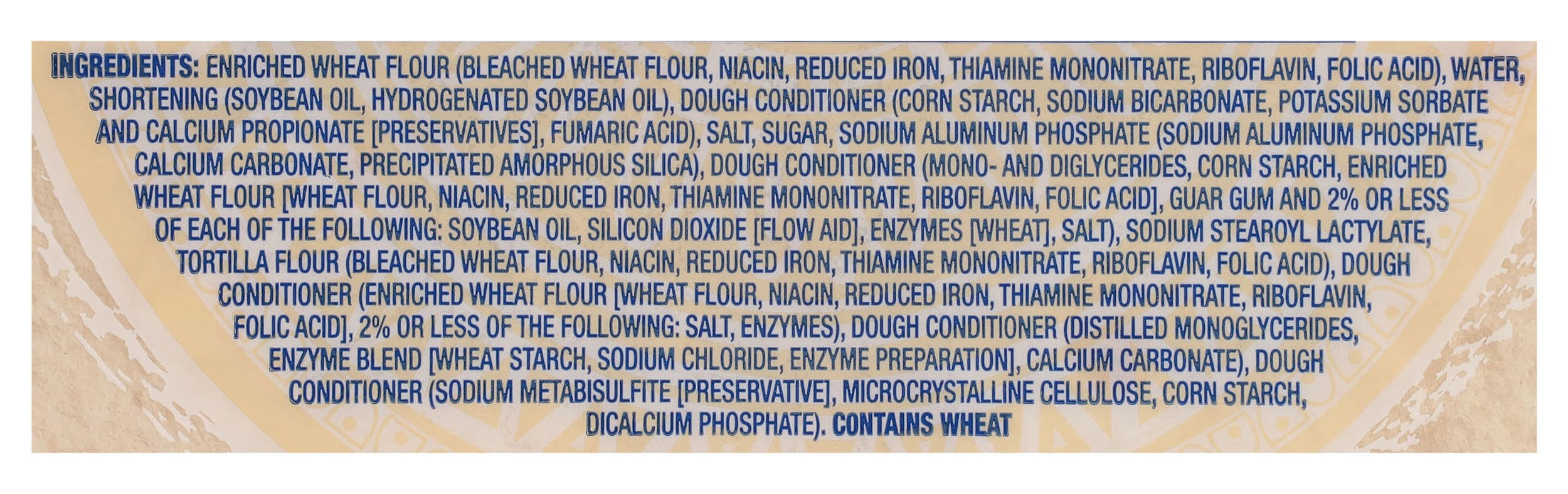 Ingredients: Enriched Wheat Flour (Bleached Wheat Flour, Niacin, Reduced Iron, Thiamine Mononitrate, Riboflavin, Folic Acid), Water, Shortening (Soybean Oil, Hydrogenated Soybean Oil), Dough Conditioner (Corn Starch, Sodium Bicarbonate, Potassium Sorbate and Calcium Propionate [Preservatives], Fumaric Acid), Salt, Sugar, Sodium Aluminum Phosphate (Sodium Aluminum Phosphate, Calcium Carbonate, Precipitated Amorphous Silica), Dough Conditioner (Mono-and Diglycerides, Corn Starch, Enriched Wheat Flour [Wheat Flour, Niacin, Reduced Iron, Thiamine Mononitrate, Riboflavin, Folic Acid], Guar Gum and 2% or Less of Each of the Following: Soybean Oil, Silicon Dioxide [Flow Aid], Enzymes (Wheat], Salt), Sodium Stearoyl Lactylate, Tortilla Flour (Bleached Wheat Flour, Niacin, Reduced Iron, Thiamine Mononitrate, Riboflavin, Folic Acid), Dough Conditioner (Enriched Wheat Flour [Wheat Flour, Niacin, Reduced Iron, Thiamine Mononitrate, Riboflavin, Folic Acid], 2% or Less of the Following: Salt, Enzymes), Dough Conditioner (Distilled Monoglycerides, Enzyme Blend [Wheat Starch, Sodium Chloride, Enzyme Preparation], Calcium Carbonate), Dough Conditioner (Sodium Metabisulfite [Preservative], Microcrystalline Cellulose, Corn Starch, Dicalcium Phosphate) Contains: Wheat, Soybeans, Corn