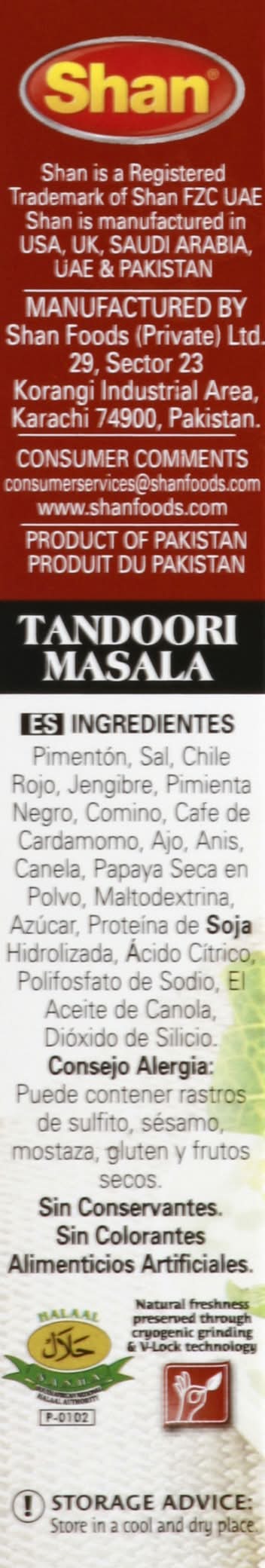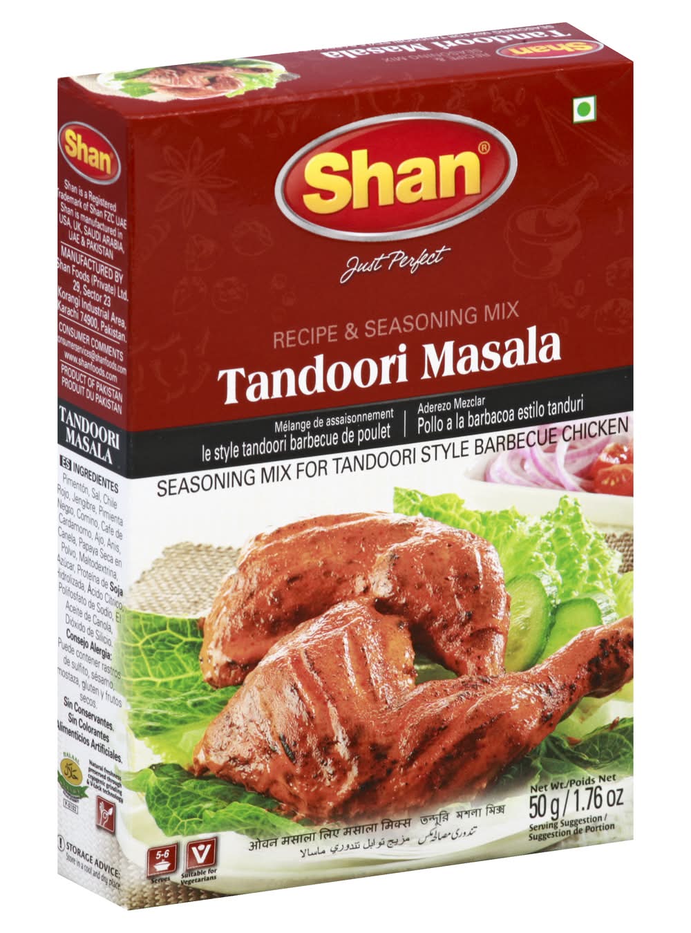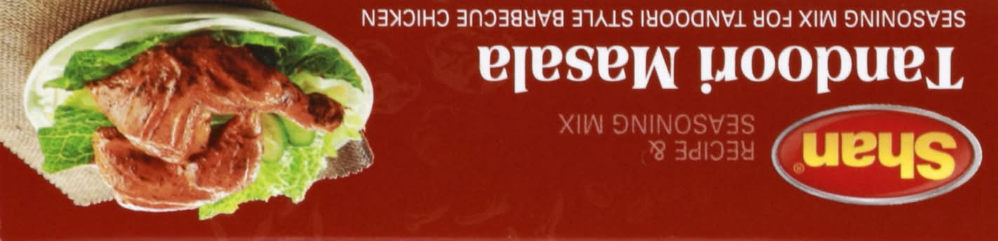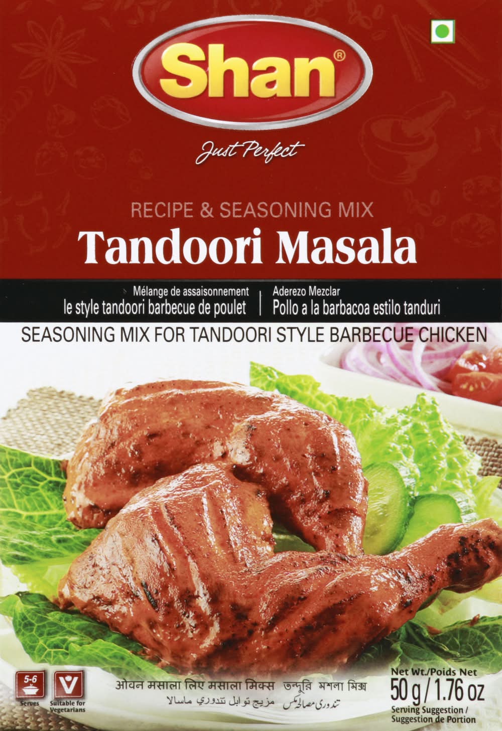 Ingredients required: chicken skinless: 1-1/2 kg/ 3.3 lbs; 8-12 portions, make slits on each. plain yogurt: 1 cup/ 200 g, whipped & strained. lemon juice: 5-6 tablespoons. red food color no. 6: 1/4 to 1/2 teaspoon. cooking oil/ melted butter: 4-6 tablespoons. shan tandoori masala mix: 1 packet, do not mix in water. steps of cooking: 1. mix lemon juice, food color, shan tandoori masala mix and 2 tablespoons oil in butter. apply to chicken pieces. prick all over the meat. set aside for 30 minutes. 2. apply strained yogurt and set aside for 3 hours +. 3. arrange the pieces in a tray and discard the marinade. 4. bake in a preheated oven, (350 degrees f) for 25 minutes. apply remaining oil / melted butter on chicken and place the tray under high setting of grill until lightly brown or barbecue. serving suggestion: serve hot chicken tandoori with shan tamarind / green chutney. recipe translation printed inside: french, urdu, hindi & bangla. storage advice: store in a cool and dry place.