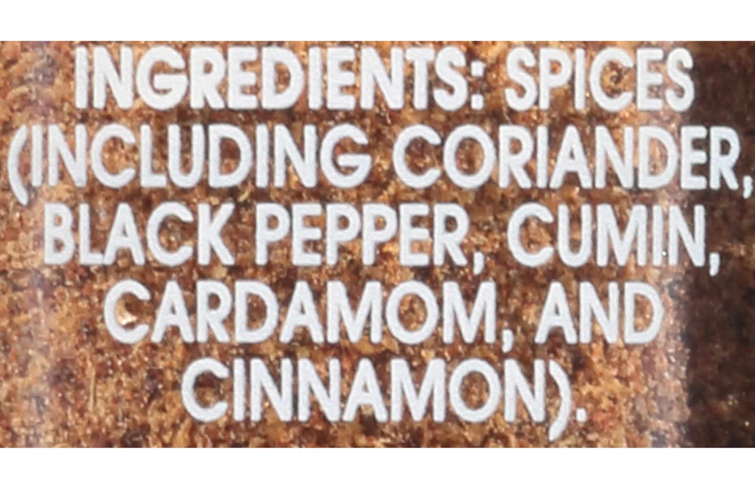 Ingredients: Spices (Including Coriander, Black Pepper, Cumin, Cardamom, and Cinnamon).