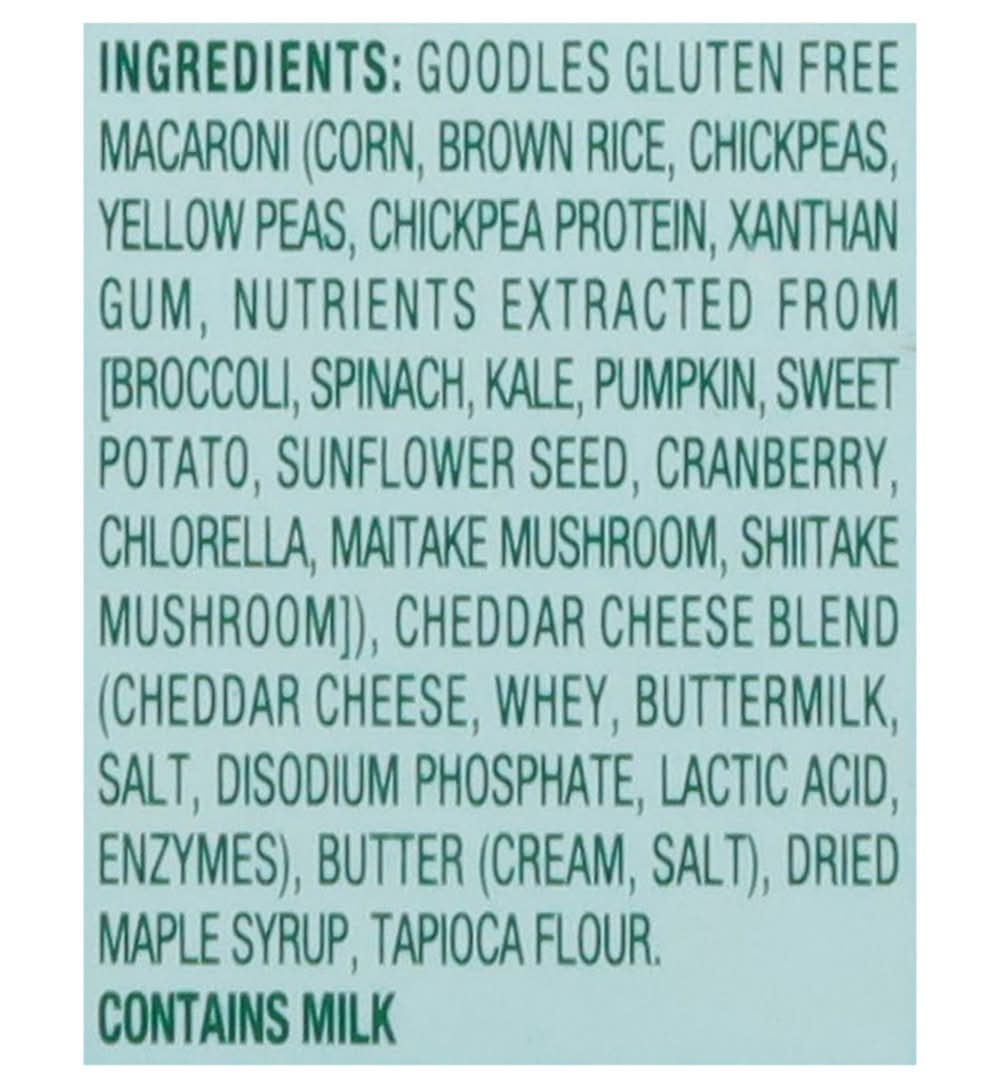 Ingredients: Goodles Gluten Free Macaroni (Corn, Brown Rice, Chickpeas, Yellow Peas, Chickpea Protein, Xanthan Gum, Nutrients Extracted from [Broccoli, Spinach, Kale, Pumpkin, Sweet Potato, Sunflower Seed, Cranberry, Chlorella, Maitake Mushroom, Shiitake Mushroom]), Cheddar Cheese Blend (Cheddar Cheese, Whey, Buttermilk, Salt, Disodium Phosphate, Lactic Acid, Enzymes), Butter (Cream, Salt), Dried Maple Syrup, Tapioca Flour Contains: Milk, Corn