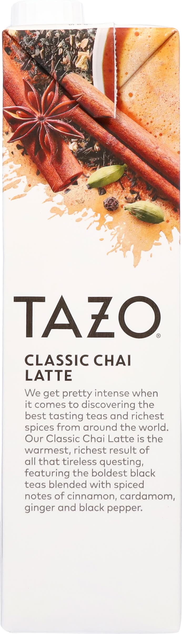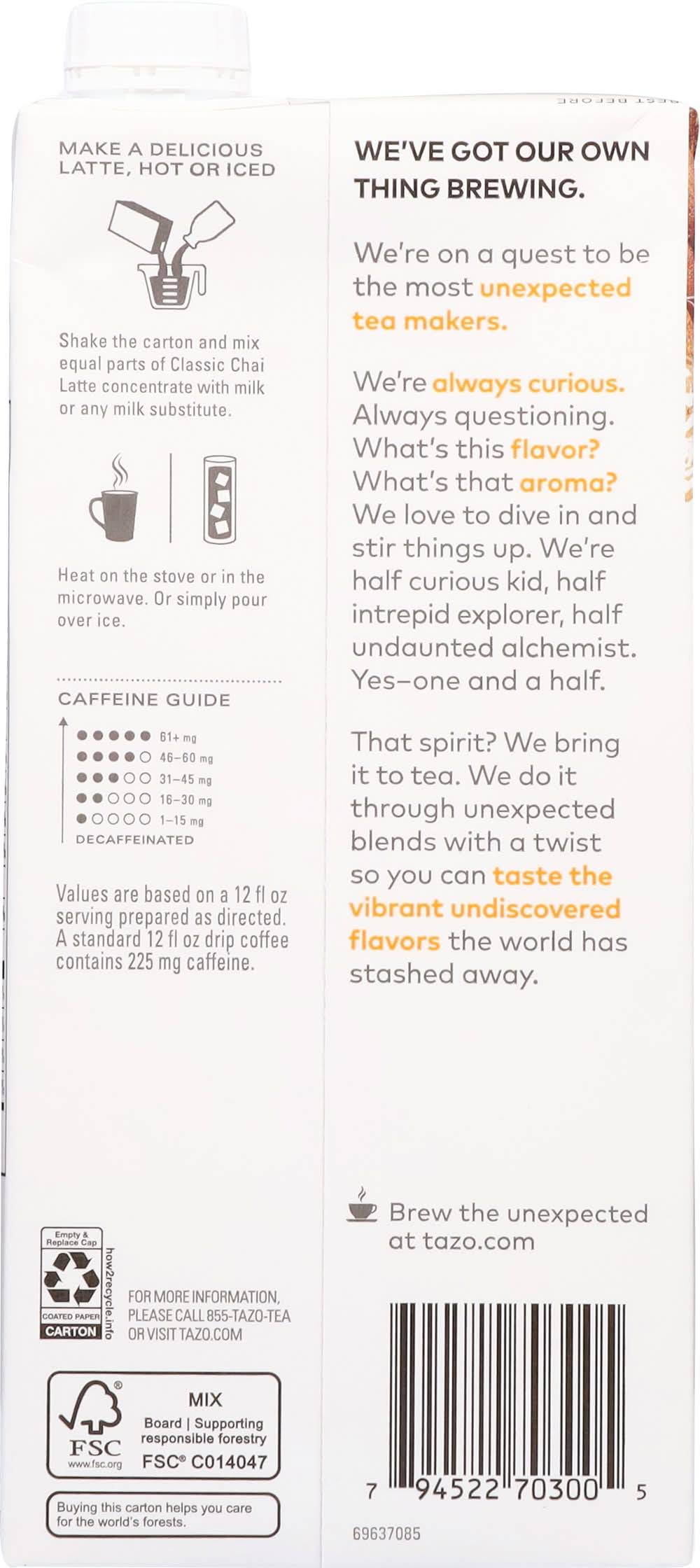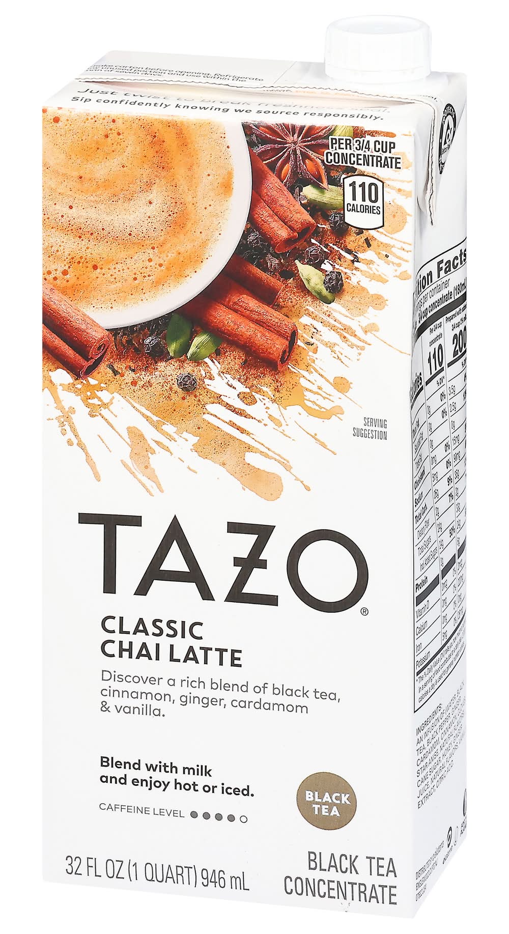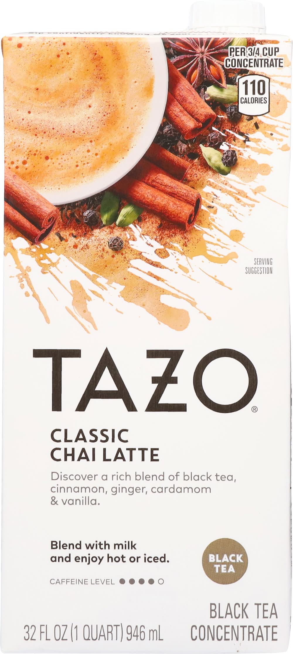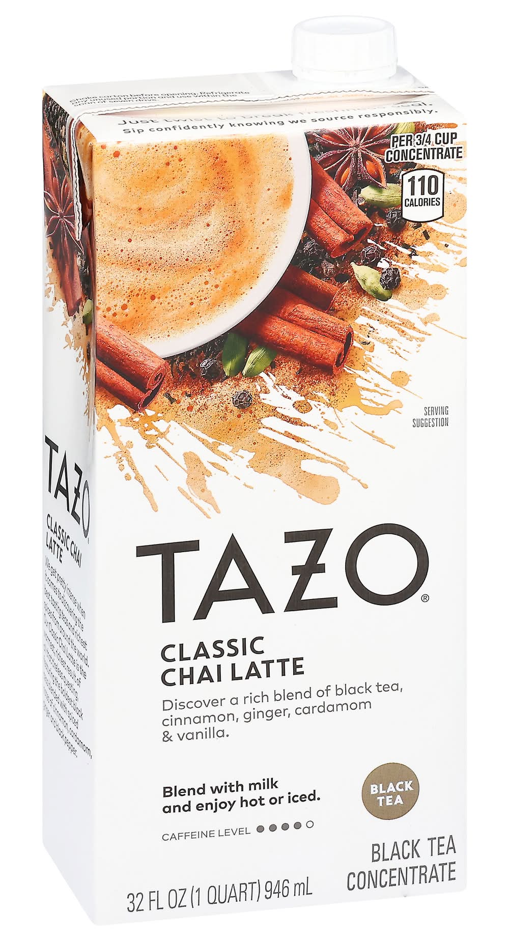 Discover a rich blend of black tea, cinnamon, ginger, cardamom & vanilla. Per 3/4 Cup Concentrate: 110 calories. Caffeine level: 4. Caffeine Guide: 5: 61+ mg; 4 :46-60 mg; 3: 31-45 mg; 2: 16-30 mg; 1: 1-15 mg. Decaffeinated. Values are based on a 12 fl oz serving prepared as directed. A standard 12 fl oz drip coffee contains 225 mg caffeine. We've got our own thing brewing. We're on a quest to be the most unexpected tea makers. We're always curious. Always questioning. What's this flavor? What's that aroma? We love to dive in and stir things up. We're half curious kid, half intrepid explorer, half undaunted alchemist. Yes-one and a half. That spirit? We bring it to tea. We do it through unexpected blends with a twist so you can taste the vibrant undiscovered flavors the world has stashed away. We get pretty intense when it comes to discovering the best tasting teas and richest spices from around the world. Our Classic Chai Latte is the warmest, richest result of all that tireless questing, featuring the boldest black teas blended with spiced notes of cinnamon, cardamom, ginger and black pepper. • Unilever, Englewood Cliffs, NJ, 07632 • Packaging: Reusable