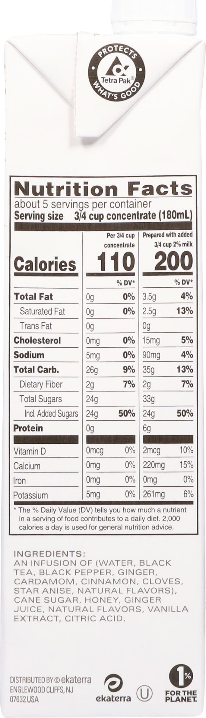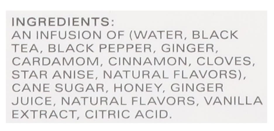 Ingredients: An Infusion of (Water, Black Tea, Black Pepper, Ginger, Cardamom, Cinnamon, Cloves, Star Anise, Natural Flavors), Cane Sugar, Honey, Ginger Juice, Natural Flavors, Vanilla Extract, Citric Acid