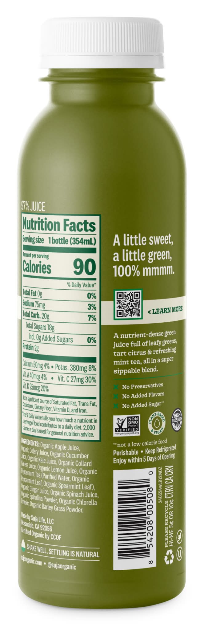 Suja Organic Mighty Dozen is a little sweet, a little green and perfectly balanced. This green juice will have you feeling mighty good and mighty healthy with 1.5 servings of fruit and vegetables per bottle. Full of organic cold pressed juice from fruits and vegetables with no added sugar, this 12 fl oz bottle of green juice is an excellent source of vitamin K and a good source of vitamin C. Mighty Dozen blends 12 earthy greens—including kale, spinach, collard greens, spirulina and chlorella—with green apple, mint tea and a lemon and ginger zing for a nutritious organic juice. Make every sip count with Suja juice to give your body a nutrient boost with breakfast, at school, while traveling or post-workout. Packaging: Reusable