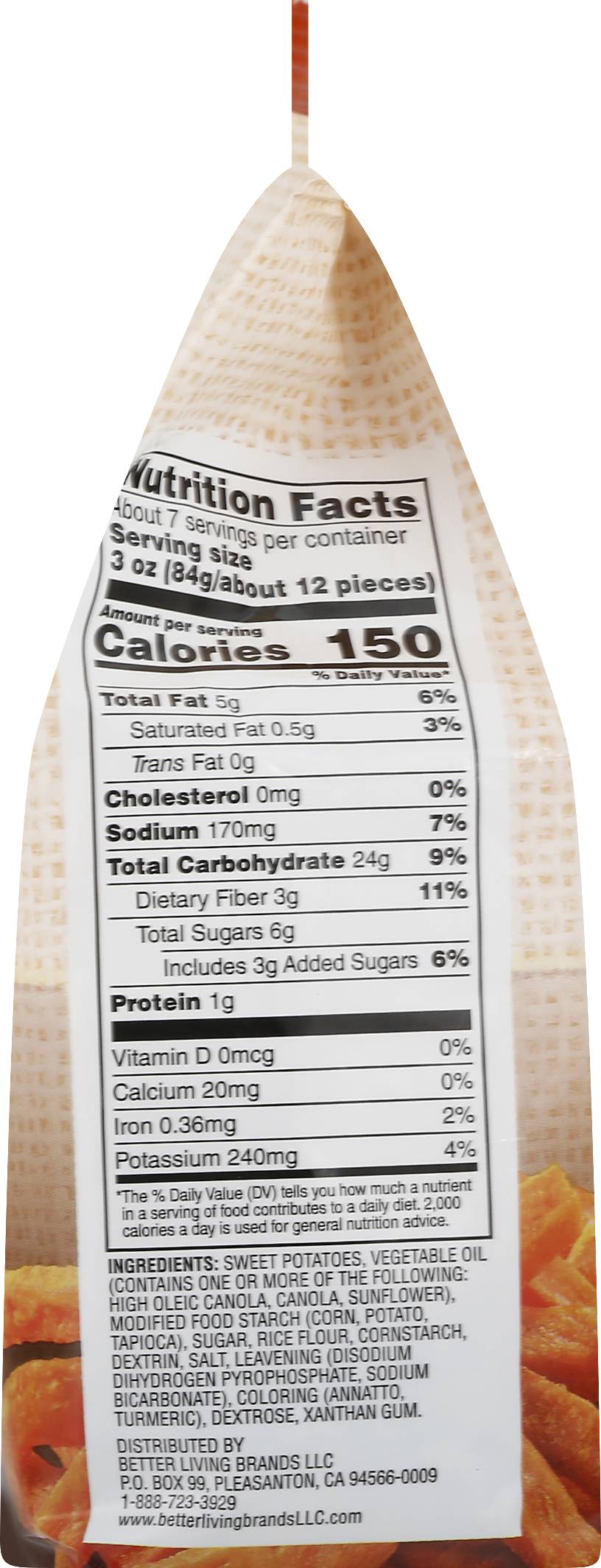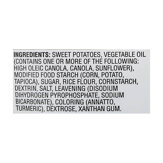 Ingredients: Sweet Potatoes, Vegetable Oil (Contains One or More of the Following: High Oleic Canola, Canola, Sunflower), Modified Food Starch (Corn, Potato, Tapioca), Sugar, Rice Flour, Cornstarch, Dextrin, Salt, Leavening (Disodium Dihydrogen Pyrophosphate, Sodium Bicarbonate), Coloring (Annatto, Turmeric), Dextrose, Xanthan Gum.