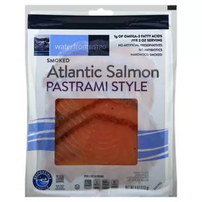 Waterfront Bistro Smoked Atlantic Salmon Pastrami Style is a premium seafood product characterized by a rich, full-bodied smoky texture. Each 2 oz serving contains 110 calories, 1 g of saturated fat, 560 mg of sodium, 0 g of total sugars, and 1 g of omega-3 fatty acids. This product is free from artificial preservatives and antibiotics, ensuring a more natural choice for consumers. The salmon is hardwood smoked and ready to eat, making it a convenient addition to meals at any time of the day. The thin-sliced, cold-smoked Atlantic salmon is raised in the pure Fjords of Norway and features a pastrami-style seasoning on the top layer for a unique and balanced flavor. This product is perishable and is sourced responsibly, adhering to strict standards for environmental and social responsibility, traceability, and food safety. It is a product of Germany and farm-raised in Norway.