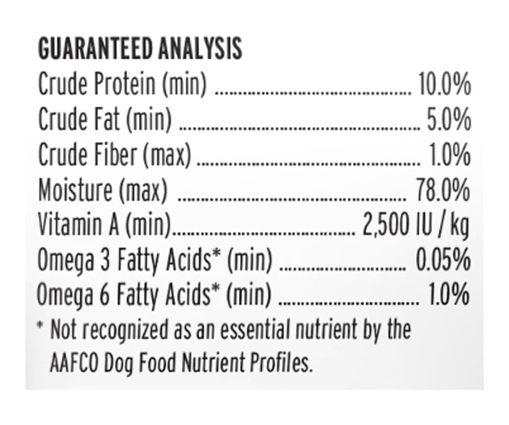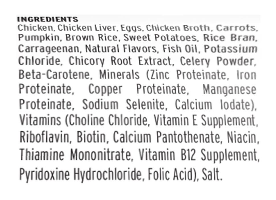 Ingredients: Chicken, Chicken Liver, Eggs, Chicken Broth, Carrots, Pumpkin, Brown Rice, Sweet Potatoes, Rice Bran, Carrageenan, Natural Flavors, Fish Oil, Potassium Chloride, Chicory Root Extract, Celery Powder, Beta-Carotene, Minerals (Zinc Proteinate, Iron Proteinate, Copper Proteinate, Manganese Proteinate, Sodium Selenite, Calcium Iodate), Vitamins (Choline Chloride, Vitamin E Supplement, Riboflavin, Biotin, Calcium Pantothenate, Niacin, Thiamine Mononitrate, Vitamin B12 Supplement, Pyridoxine Hydrochloride, Folic Acid), Salt Contains: Eggs, Fish, Celery