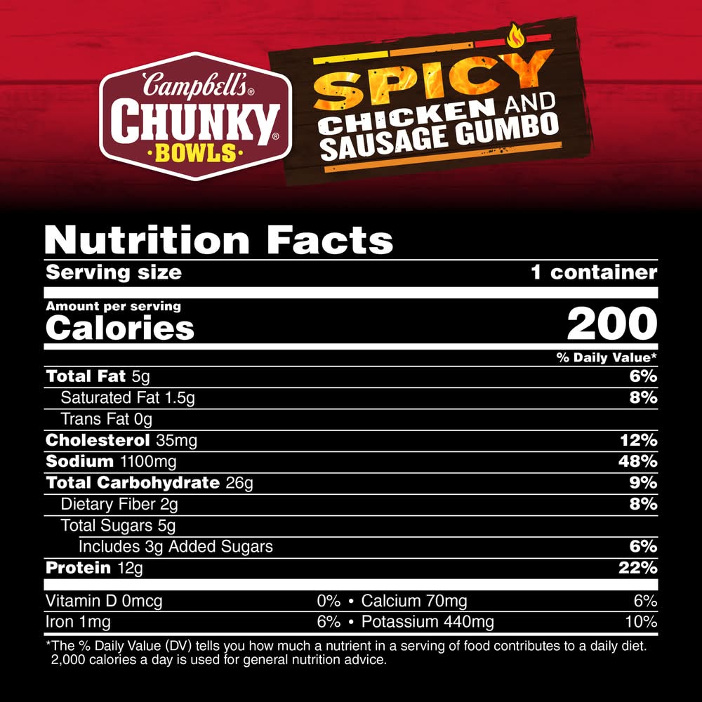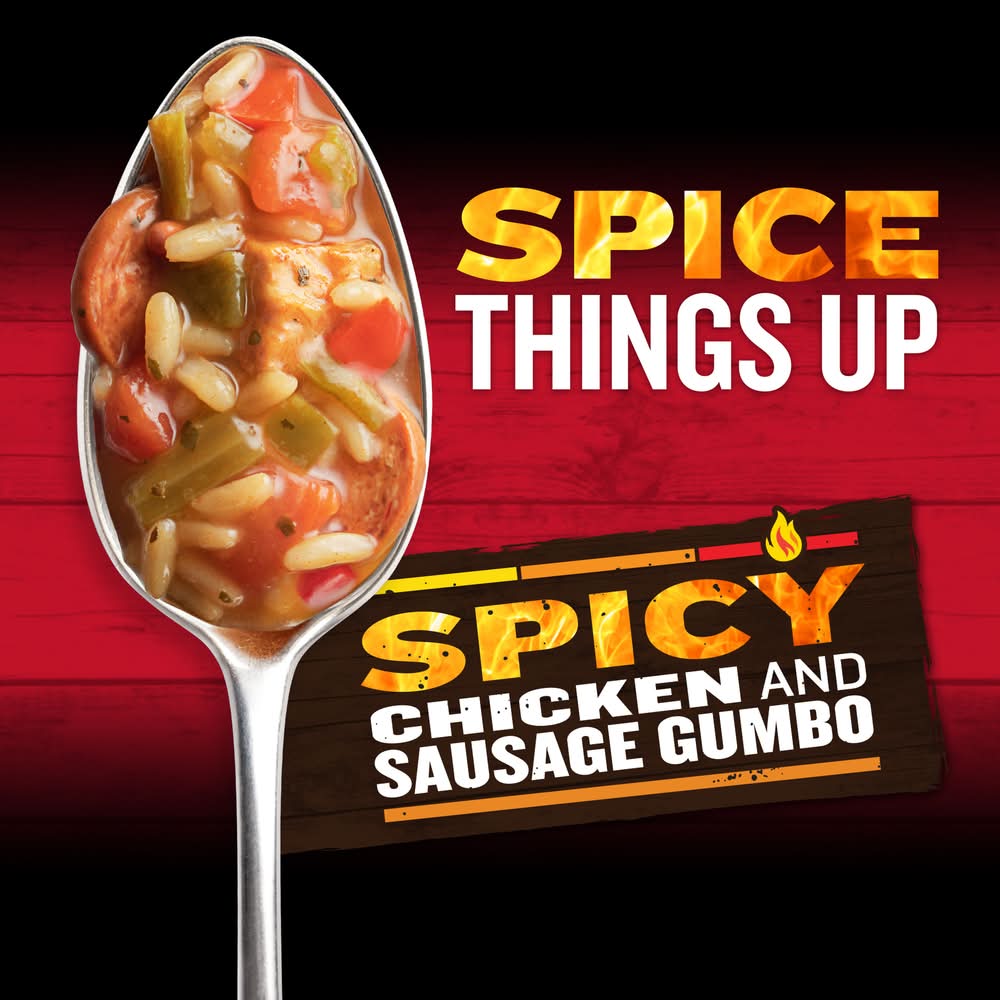Campbell’s Chunky Spicy Chicken and Sausage Gumbo isn’t just tasty—it's made to spice up your life. With mouth-watering, sizzling flavors and bold ingredients, this soup is capable of fueling even the heartiest appetite. A spicy spin on classic comfort food, this chicken soup is bursting with flavor from hearty pieces of chicken meat with no antibiotics, Andouille sausage, okra, peppers and vibrant spices. Each bowlhas 12 grams of protein. It Fills You Up Right. This chicken gumbo soup is great on its own or poured over a bed of rice. Just pop this spicy soup into a saucepan or microwave-safe bowl, heat and enjoy. Whether you’re looking for quick and easy microwave soups for home or something to take on the go, Campbell’s has you covered. The soup bowl is recyclable for easy disposal. Take on the great outdoors with Campbell’s Chunky Spicy Chicken and Sausage Gumbo—Soup That Eats Like a Meal. Flavor: Spicy chicken & sausage gumbo