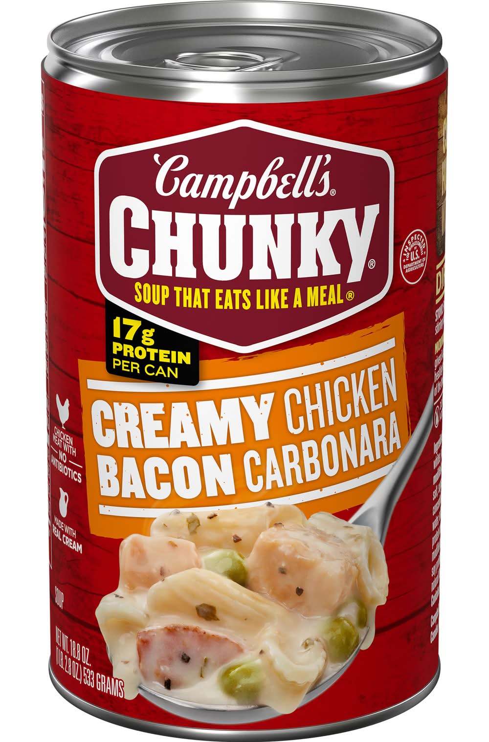 Tackle your hunger with Campbell’s Chunky Creamy Chicken Bacon Carbonara Soup. This chunky chicken soup features big pieces of chicken meat with no antibiotics plus enriched pasta, bacon bits, peas and real cream for a comforting taste that’s just like mom used to make. With 17g of protein per can, it’s a satisfyingly rich and creamy soup that fuels even the heartiest of appetites. Campbell’s Chunky Soup is a year-round pantry staple and the MVP of game day snacks, delivering a winning combination of flavor and convenience. Enjoy a warm bowl of this canned soup when watching the game from home, or use it as an ingredient in dips, casseroles and other tailgating recipes. To prepare the microwave soup, simply pour into a microwave-safe bowl and heat — do not add water. Or heat in a saucepan on the stove, stirring occasionally. Whether you’re a football fan or simply craving something hearty, Campbell’s Chunky Creamy Chicken Bacon Carbonara Soup will keep you feeling full and satisfied from kickoff to the final whistle. Make every game day a winner with Campbell's Chunky – Soup That Eats Like a Meal.