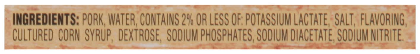 Ingredients: Pork, Water, Contains 2% or Less of Potassium Lactate, Salt, Flavoring, Cultured Corn Syrup, Dextrose, Sodium Phosphates, Sodium Diacetate, Sodium Nitrite