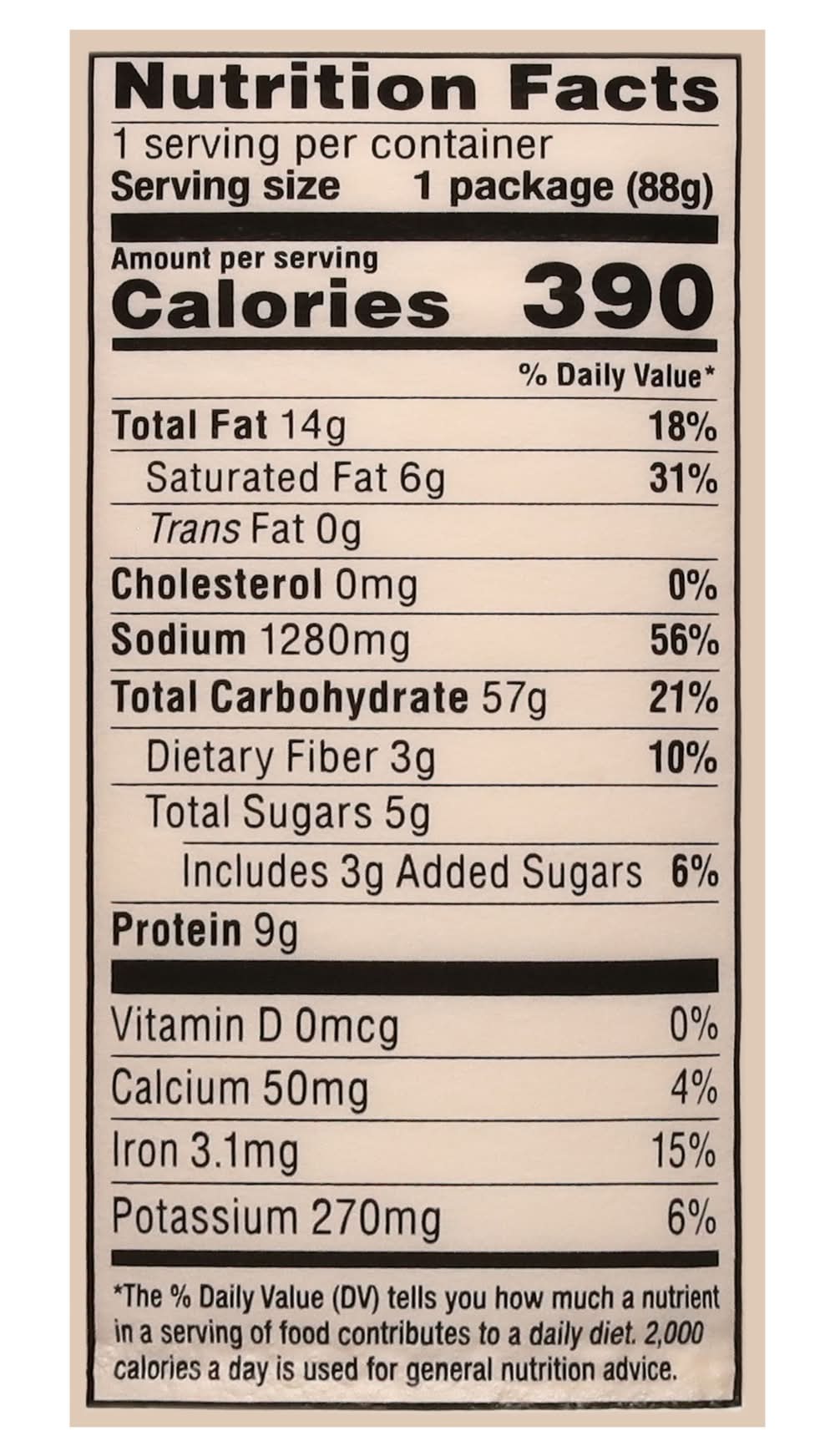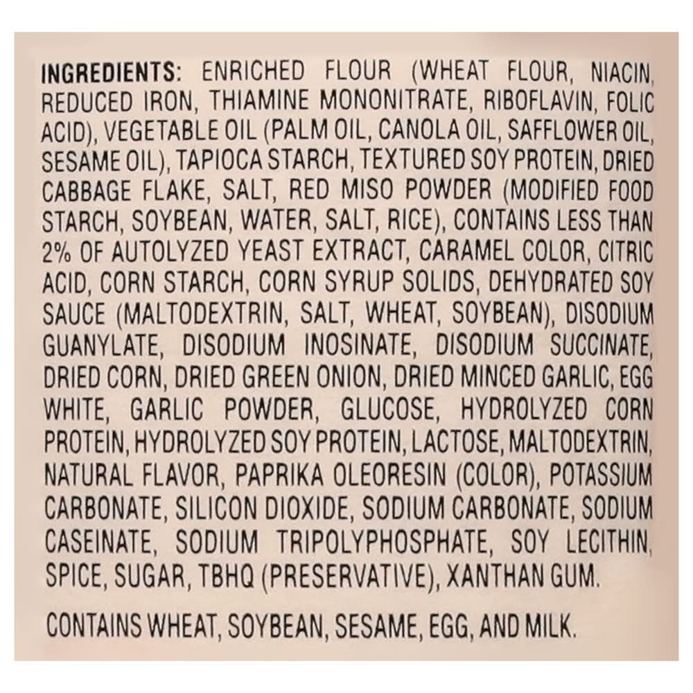 Ingredients: Enriched Flour (Wheat Flour, Niacin, Reduced Iron, Thiamine Mononitrate, Riboflavin, Folic Acid), Vegetable Oil (Palm Oil, Canola Oil, Safflower Oil, Sesame Oil), Tapioca Starch, Textured Soy Protein, Dried Cabbage Flake, Salt, Red Miso Powder (Modified Food Starch, Soybean, Water, Salt, Rice), Contains Less than 2% of Autolyzed Yeast Extract, Caramel Color, Citric Acid, Corn Starch, Corn Syrup Solids, Dehydrated Soy Sauce (Maltodextrin, Salt, Wheat, Soybean), Disodium Guanylate, Disodium Inosinate, Disodium Succinate, Dried Corn, Dried Green Onion, Dried Minced Garlic, Egg White, Garlic Powder, Glucose, Hydrolyzed Corn Protein, Hydrolyzed Soy Protein, Lactose, Maltodextrin, Natural Flavor, Paprika Oleoresin (Color), Potassium Carbonate, Silicon Dioxide, Sodium Carbonate, Sodium Caseinate, Sodium Tripolyphosphate, Soy Lecithin, Spice, Sugar, TBHQ (Preservative), Xanthan Gum Contains: Wheat, Soybeans, Sesame, Eggs, Milk, Lactose, Peanuts, Tree Nuts, Crustacean Shellfish, Fish