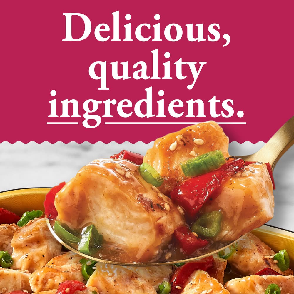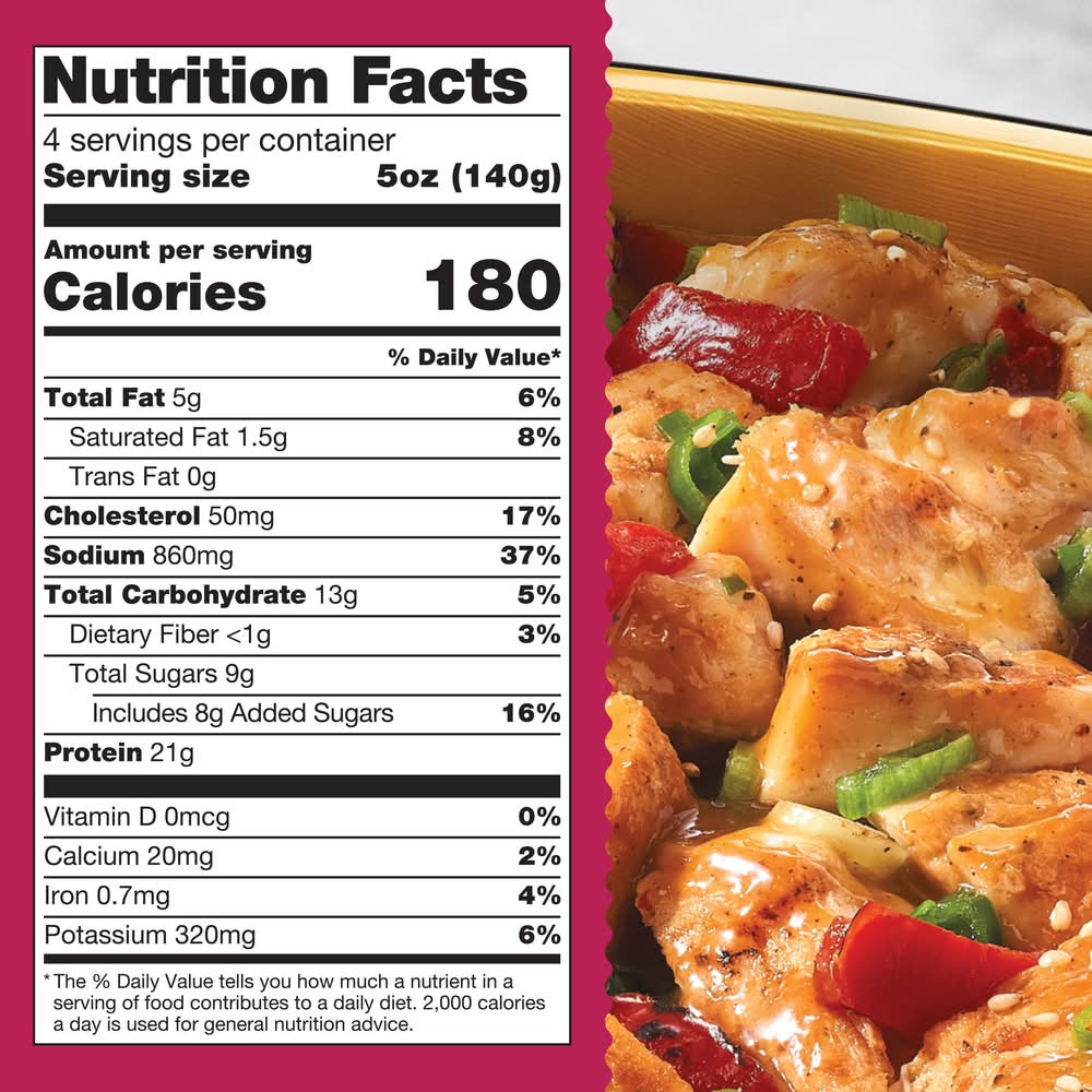 Ingredients: SOUS VIDE COOKED SEASONED ROASTED CHICKEN BREAST WITH RIB MEAT (CHICKEN BREAST WITH RIB MEAT, WATER, CONTAINS 2% OR LESS OF SEASONING [MALTODEXTRIN, ONION POWDER, SPICES, GARLIC POWDER, NATURAL FLAVOR], SALT, RICE STARCH, SOYBEAN OIL, SODIUM PHOSPHATE, SEASONING [CHICKEN FAT, CHICKEN BROTH, NATURAL FLAVOR], BLACK PEPPER, PAPRIKA), SAUCE (WATER, HONEY, REDUCED SODIUM SOY SAUCE [WATER, WHEAT, SOYBEANS, SALT, ALCOHOL, VINEGAR, LACTIC ACID], GINGER, BROWN SUGAR, ONION CONCENTRATE [SAUTED ONIONS, SALT, BUTTER (CREAM [MILK], LACTIC ACID), SUGAR, ONION POWDER, YEAST EXTRACT, NATURAL FLAVOR, CORN SYRUP SOLIDS], ROASTED SESAME OIL, GARLIC, CHICKEN FLAVOR [CHICKEN, YEAST EXTRACT, SALT, FLAVORINGS], SALTED MIRIN WINE [SAKE (WATER, RICE, KOJI [ASPERGILLUS ORYZAE]), SUGAR, WATER, SALT, YEAST EXTRACT], CORNSTARCH, APPLE CIDER VINEGAR, SPICES, SESAME SEEDS, XANTHAN GUM, YEAST EXTRACT, GARLIC POWDER), RED BELL PEPPERS, GREEN ONIONS, SESAME SEEDS. Contains: CONTAINS: WHEAT, SOY, MILK, SESAME.