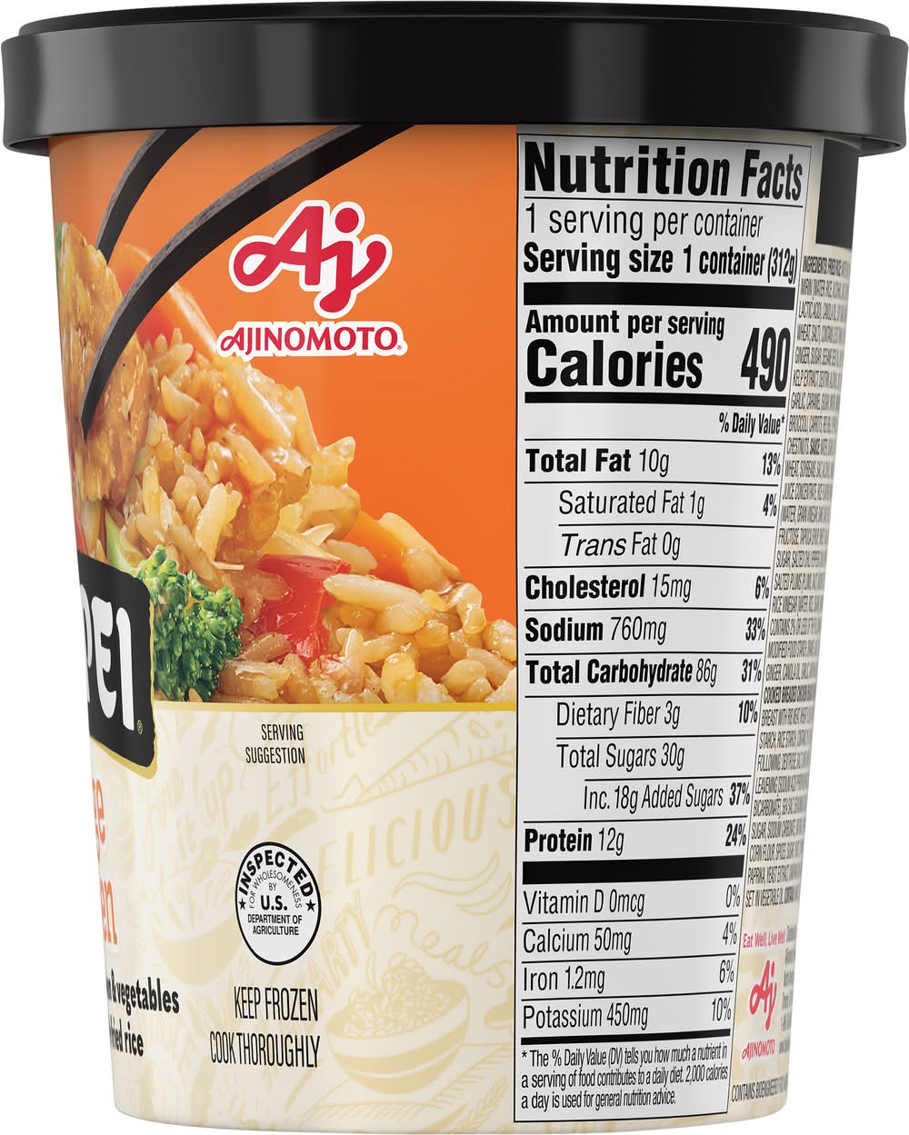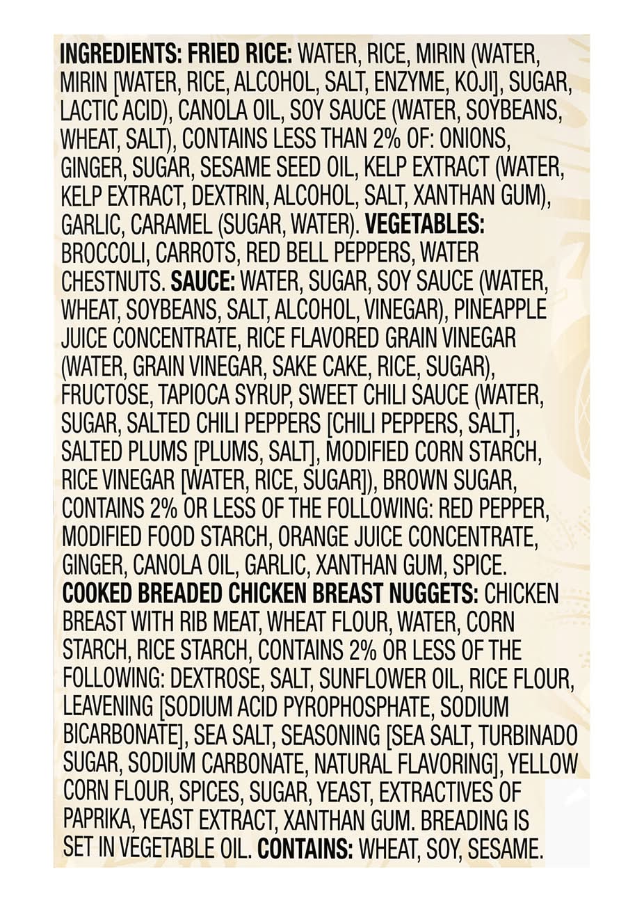 Ingredients: Fried Rice: Water, Rice, Mirin (Water, Mirin Water, Rice, Alcohol, Salt, Enzyme, Kojiį, Sugar, Lactic Acid), Canola Oil, Soy Sauce (Water, Soybeans, Wheat, Salt), Contains Less than 2% of: Onions, Ginger, Sugar, Sesame Seed Oil, Kelp Extract (Water, Kelp Extract, Dextrin, Alcohol, Salt, Xanthan Gum, Garlic, Caramel (Sugar, Water), Vegetables: Broccoli, Carrots, Red Bell Peppers, Water Chestnuts Sauce: Water, Sugar, Soy Sauce (Water Wheat, Soybeans, Salt, Alcohol, Vinegar, Pineapple Juice Concentrate, Rice Flavored Grain Vinegar (Water, Grain Vinegar, Sake Cake, Rice, Sugar), Fructose, Tapioca Syrup, Sweet Chili Sauce (Water, Sugar, Salted Chili Peppers [Chili Peppers, Salt), Salted Plums (Plums, Salt, Modified Corn Starch, Rice Vinegar (Water, Rice, Sugar, Brown Sugar Contains 2% or Less of the Following: Red Pepper, Modified Food Starch, Orange Juice Concentrate, Ginger, Canola Oil, Garlic, Xanthan Gum, Spice, Cooked Breaded Chicken Breast Nuggets: Chicken Breast with Rib Meat, Wheat Flour, Water, Corn Starch, Rice Starch, Contains 2% or Less of the Following: Dextrose, Salt, Sunflower Oil, Rice Flour, Leavening Sodium Acid Pyrophosphate, Sodium Bicarbonate, Sea Salt, Seasoning (Sea Salt, Turbinado Sugar, Sodium Carbonate, Natural Flavoring), Yellow Corn Flour, Spices, Sugar, Yeast, Extractives of Paprika, Yeast Extract, Xanthan Gum Breading is Set in Vegetable Oil Contains: Wheat, Soybeans, Sesame, Corn, Tree Nuts, Chestnuts