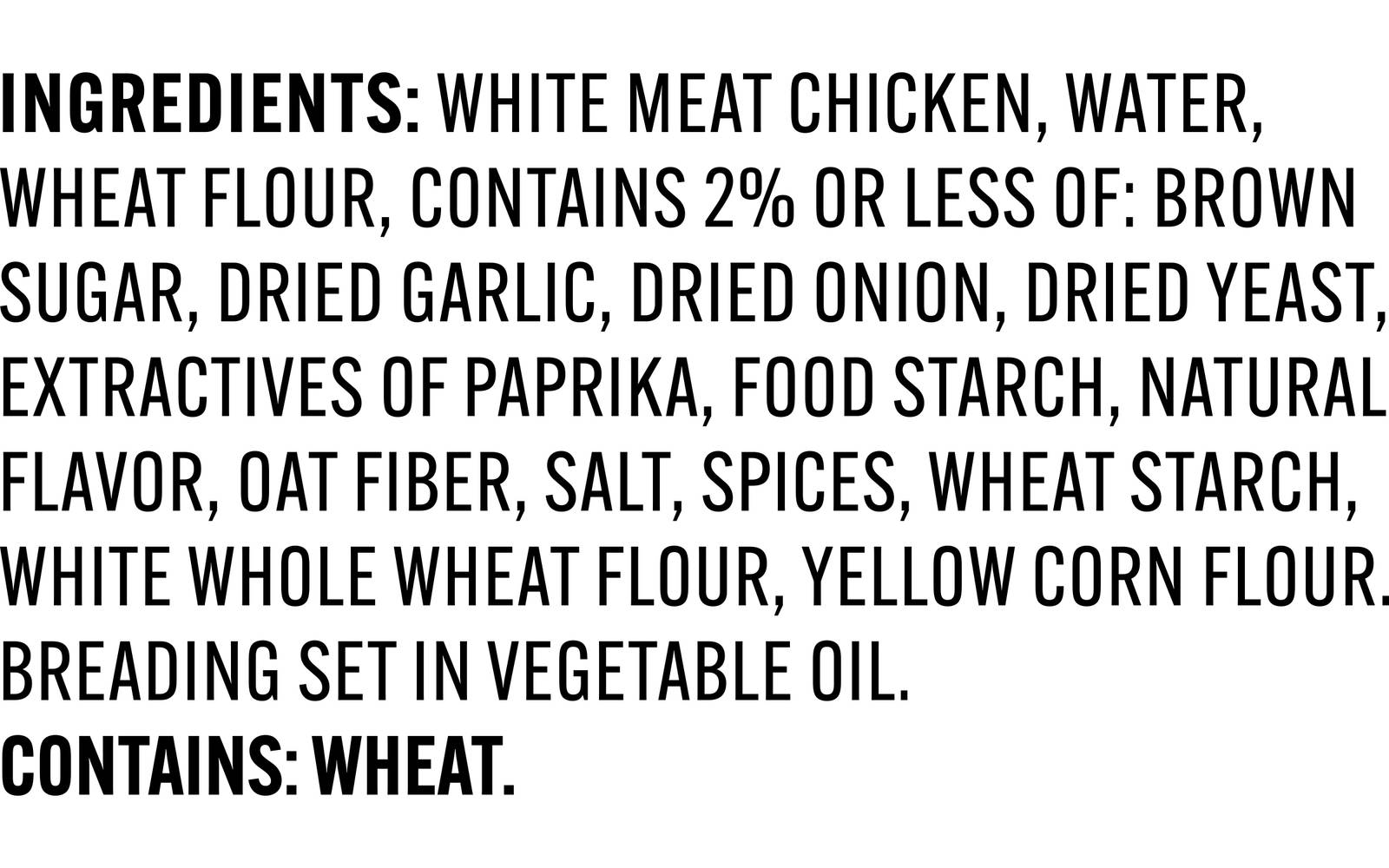 Ingredients: White Meat Chicken, Water, Contains 2% or Less of: Brown Sugar, Dried Garlic, Dried Onion, Dried Yeast, Extractives of Paprika, Food Starch, Natural Flavor, Salt, Spices, Wheat Starch, White Whole Wheat Flour, Yellow Corn Flour. Breading Set in Vegetable Oil Contains: Wheat