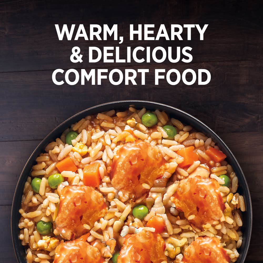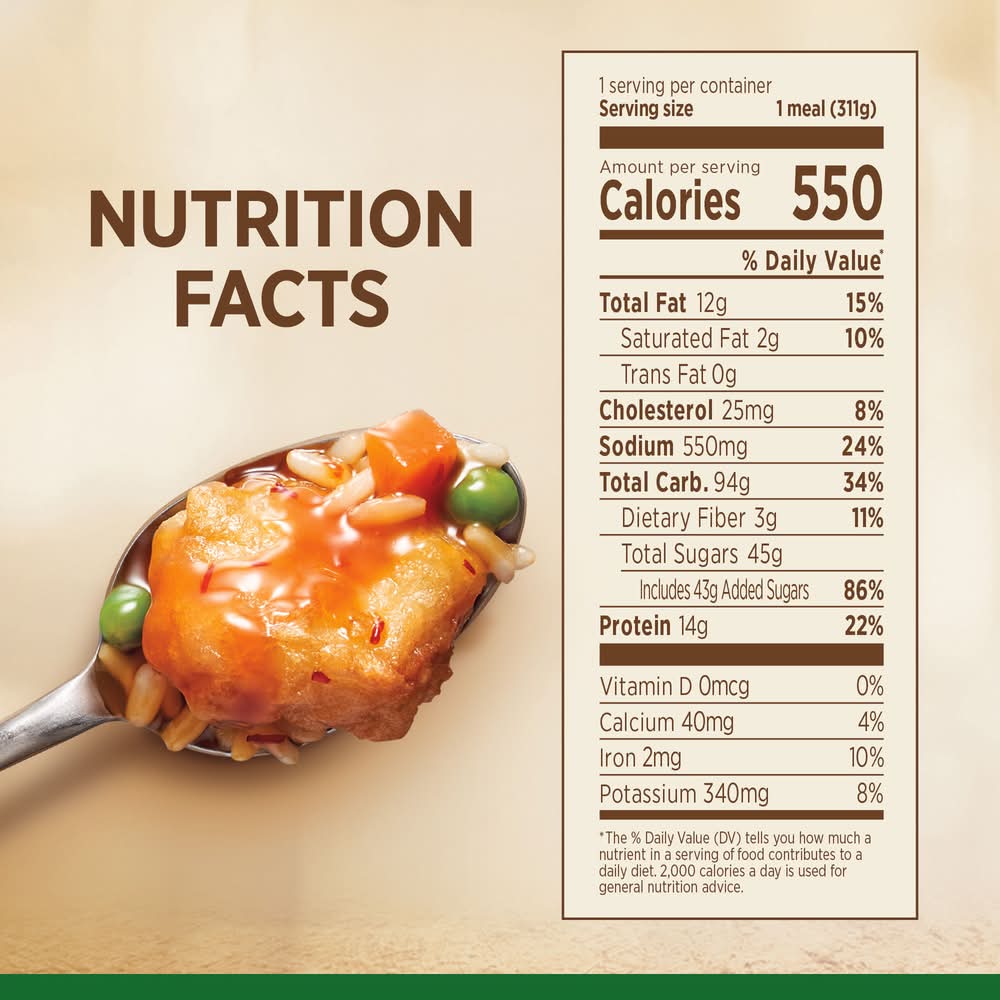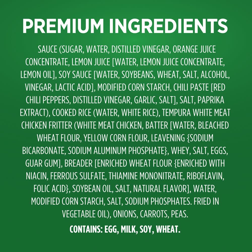 Ingredients: Sauce (Sugar Water Distilled Vinegar Orange Juice Concentrate Lemon Juice [Water Lemon Juice Concentrate Lemon Oil), Soy Sauce [Water, Soybeans, Wheat, Salt, Alcohol, Vinegar, Lactic Acid), Modified Corn Starch, Chili Paste [Red Chili Peppers, Distilled Vinegar, Garlic, Salt], Salt, Paprika Extract), Cooked Rice (Water White Rice), Tempura White Meat Chicken Fritter (White Meat Chicken Batter (Water Bleached Wheat Flour Yellow Corn Flour Leavening (Sodium Bicarbonate Sodium Aluminum Phosphate), Whey, Salt, Eggs, Guar Gum], Breader (Enriched Wheat Flour (Enriched with Niacin Ferrous Sulfate Thiamine Mononitrate Riboflavin Folic Acid), Soybean Oil, Salt, Natural Flavor], Water, Modified Corn Starch, Salt, Sodium Phosphates, Fried in Vegetable Oil), Onions, Carrots, Peas Contains: Soybeans, Corn, Wheat, Eggs, Milk