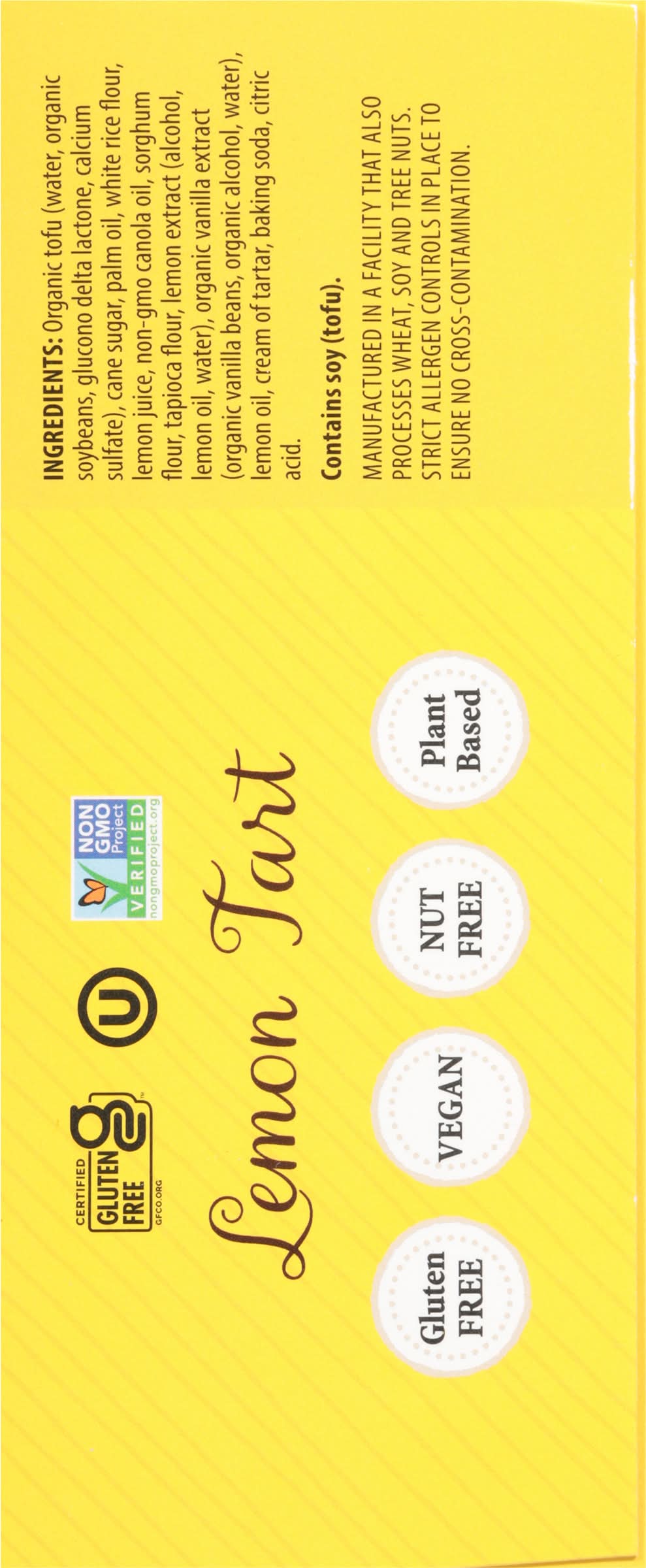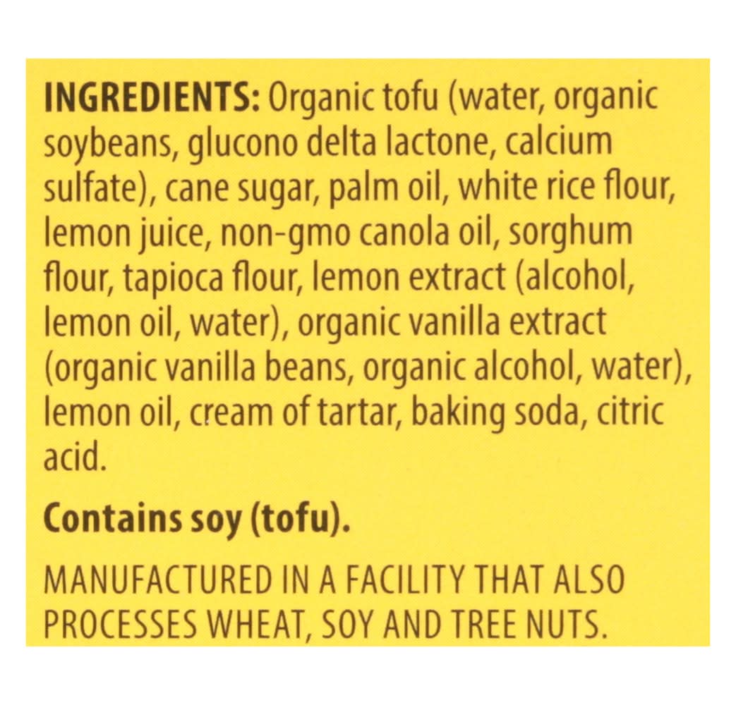 Ingredients: Organic Tofu (Water, Organic Soybeans, Glucono Delta Lactone, Calcium Sulfate), Cane Sugar, Palm Oil, White Rice Flour, Lemon Juice, Non-GMO Canola Oil, Sorghum Flour, Tapioca Flour, Lemon Extract (Alcohol, Lemon Oil, Water), Organic Vanilla Extract (Organic Vanilla Beans, Organic Alcohol, Water), Lemon Oil, Cream of Tartar, Baking Soda, Citric Acid Contains: Soybeans, Wheat