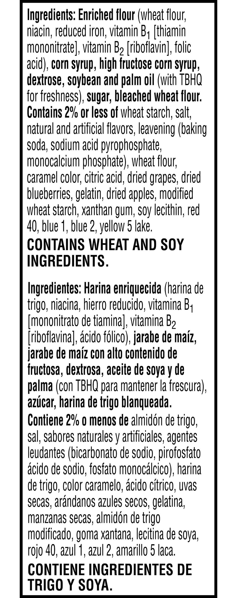 Ingredients: Enriched Flour (Wheat Flour, Niacin, Reduced Iron, Vitamin B1 [Thiamin Mononitrate], Vitamin B2 [Riboflavin], Folic Acid), Corn Syrup, High Fructose Corn Syrup, Dextrose, Soybean And Palm Oil (With Tbhq For Freshness), Sugar, Bleached Wheat Flour. Contains 2% Or Less Of Wheat Starch, Salt, Natural And Artificial Flavors, Leavening (Baking Soda, Sodium Acid Pyrophosphate, Monocalcium Phosphate), Wheat Flour, Caramel Color, Citric Acid, Dried Grapes, Dried Blueberries, Gelatin, Dried Apples, Modified Wheat Starch, Xanthan Gum, Soy Lecithin, Red 40, Blue 1, Blue 2, Yellow 5 Lake. Contains: Contains wheat and soy ingredients.