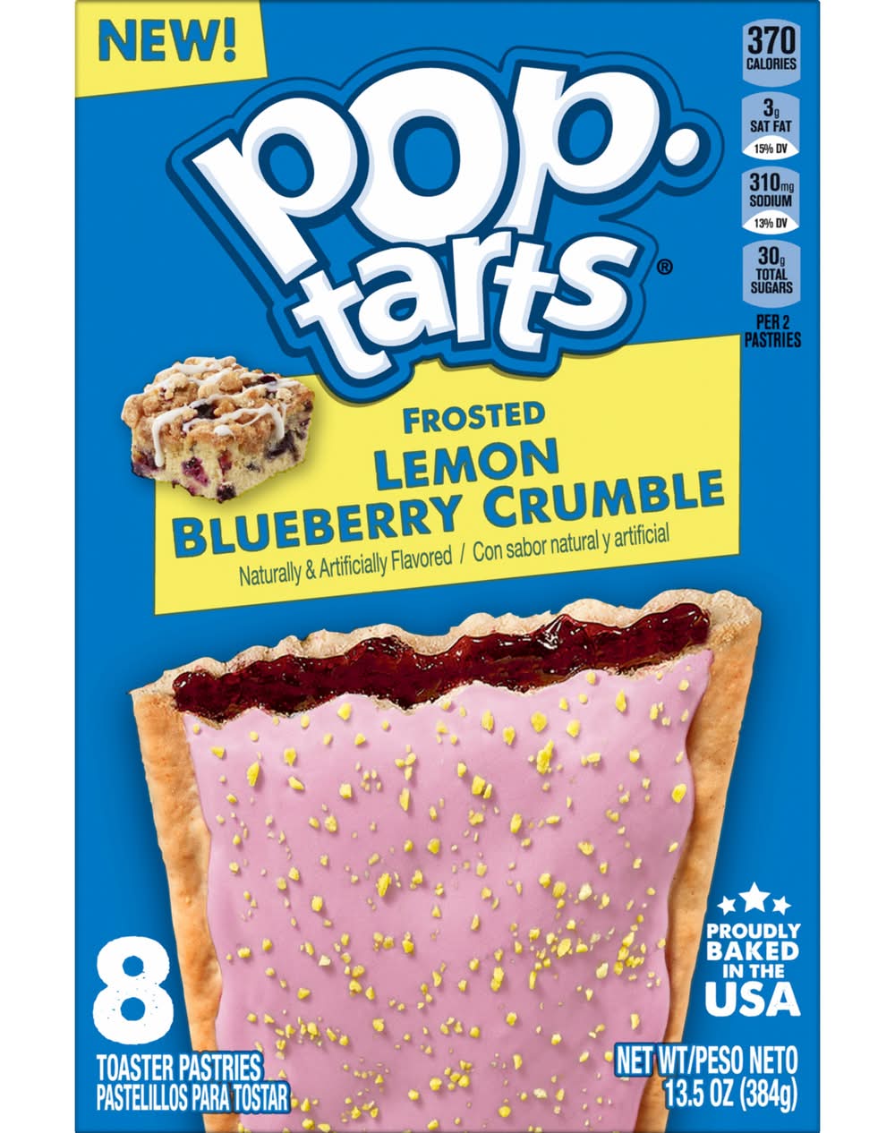 Pop-Tarts toaster pastries are the perfect sweet treat at breakfast, for lunch snack time, or dessert. Featuring a sweet lemon blueberry-flavored filling and crunchy sprinkles on a soft pastry crust, this ready to eat treat is perfect for snack time for kids and adults on the go. Pack Pop-Tarts Frosted Lemon Blueberry Crumble in lunchboxes or backpacks when it's time for school snacking, or stock the office pantry with this individually wrapped grab and go adult snack time choice. Pop them in the toaster and pair with milk, create your own ice cream sandwiches, or incorporate into your favorite dessert recipe for a sweet treat. These irresistible snack time options for kids and adults provide a good source of three B vitamins. Stock your pantry with these shelf stable snack alternatives and enjoy ready to eat treats anytime. A flavor for everyone, including beloved classics like Frosted Strawberry or Frosted Cherry, or our more indulgent flavors, Frosted Cookies and Creme or Frosted Chocolate Fudge. Flavor: Lemon-blueberry