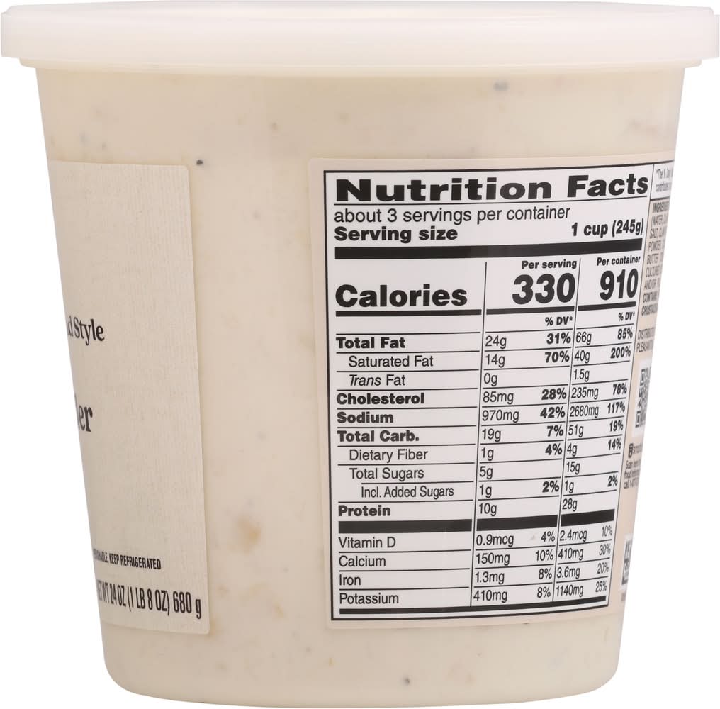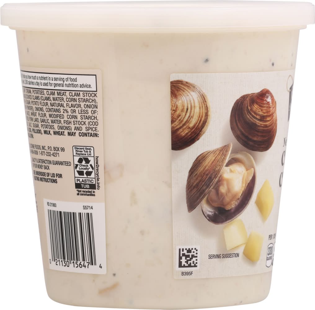 Ingredients: Light Cream, Potatoes, Clam Meat, Clam Stock (Water, Clam Base [Cooked Clams (Clams, Water, Corn Starch), Salt, Clam Broth, Sugar, Potato Flour, Natural Flavor, Onion Powder, Codfish Powder]), Onions, Contains 2% or Less of: Butter (Cream, Salt), Wheat Flour, Modified Corn Starch, Cultured Dextrose, Pork Lard, Garlic, Water, Fish Stock (Cod and/or Pollock, Salt, Sugar, Potatoes, Onions) and Spice. Contains: Fish, Milk, Wheat, Crustacean Shellfish
