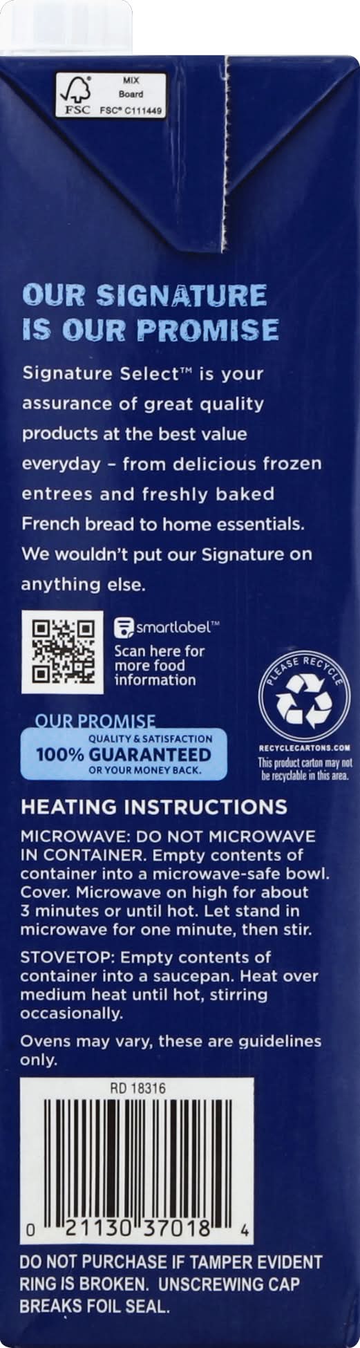 Directions for use: Heating Instructions: Microwave: Do not microwave in container. Empty contents of container into a microwave-safe bowl. Cover. Microwave on high for about 3 minutes or until hot. Let stand in microwave for one minute, then stir. Stovetop: Empty contents of container into a saucepan. Heat over medium heat until hot, stirring occasionally. Ovens vary, these are guidelines only. Do not microwave in package. Do not freeze in package. Do not purchase if punctured or torn. Store unopened carton at room temperature. Refrigerate after opening and use within 14 days. Twist to break inner seal and tamper-evident ring. Storage recommendation: Refrigerate after opening and use within 14 days.
