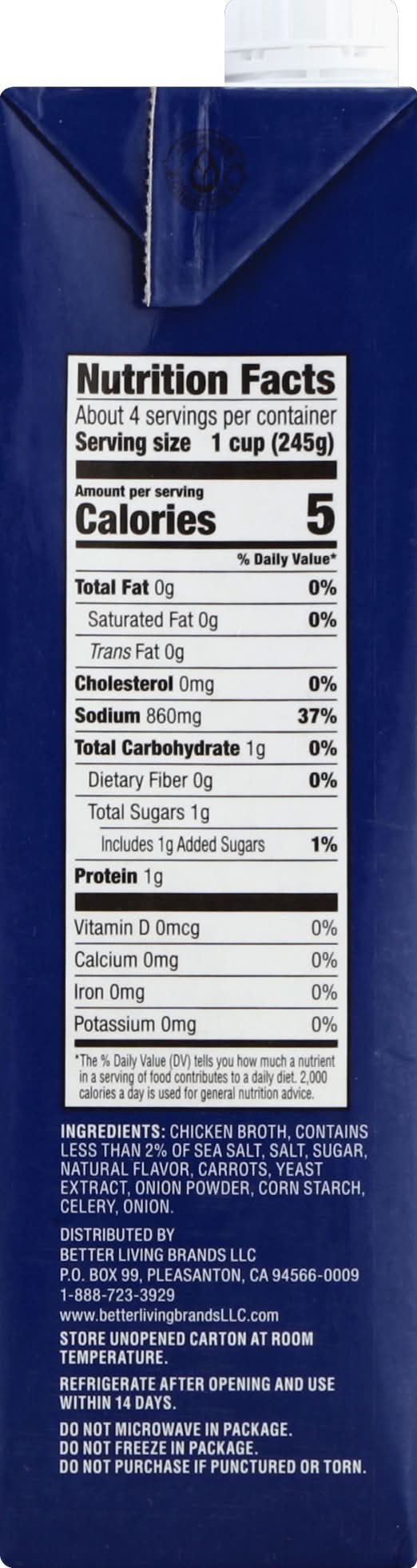 Ingredients: Chicken Broth, Contains Less than 2% of Sea Salt, Salt, Sugar, Natural Flavor, Carrots, Yeast Extract, Onion Powder, Corn Starch, Celery, Onion