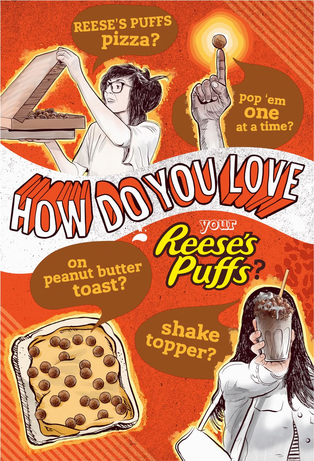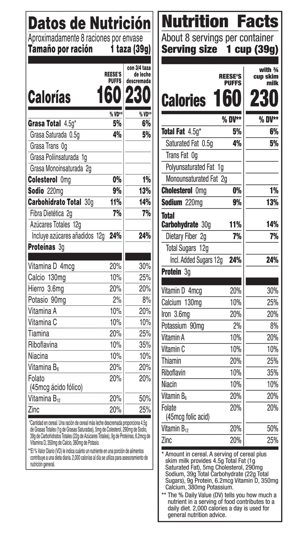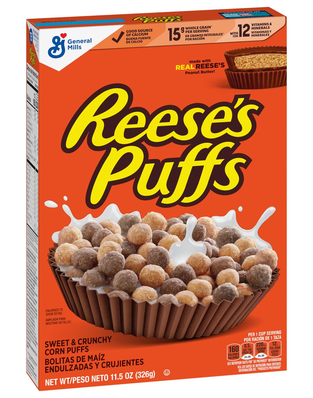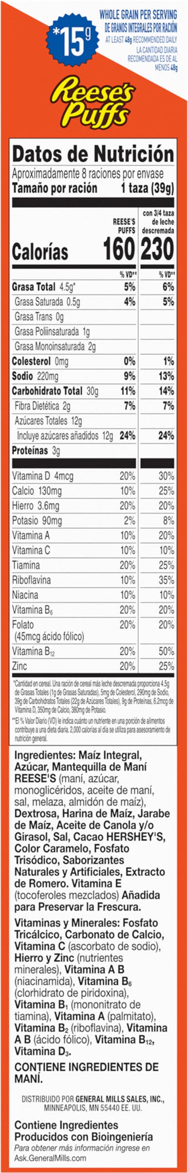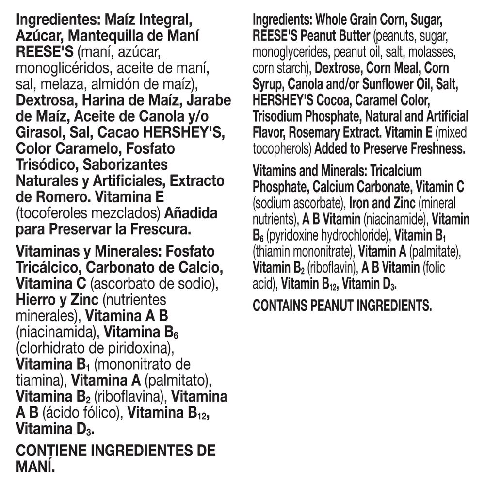Ingredients: Whole Grain Corn, Sugar, Reese's Peanut Butter (Peanuts, Sugar, Monoglycerides, Peanut Oil, Salt, Molasses, Corn Starch), Dextrose, Corn Meal, Corn Syrup, Canola and/or Sunflower Oil, Salt, Hershey's Cocoa, Caramel Color, Trisodium Phosphate, Natural and Artificial Flavor, Rosemary Extract, Vitamin E (Mixed Tocopherols) Added to Preserve Freshness. Vitamins and Minerals: Tricalcium Phosphate, Calcium Carbonate, Vitamin C (Sodium Ascorbate), Iron and Zinc (Mineral Nutrients), A B Vitamin (Niacinamide), Vitamin B6 (Pyridoxine Hydrochloride), Vitamin B1 (Thiamin Mononitrate), Vitamin A (Palmitate), Vitamin B2 (Riboflavin), A B Vitamin (Folic Acid), Vitamin B12, Vitamin D3 Contains: Peanuts