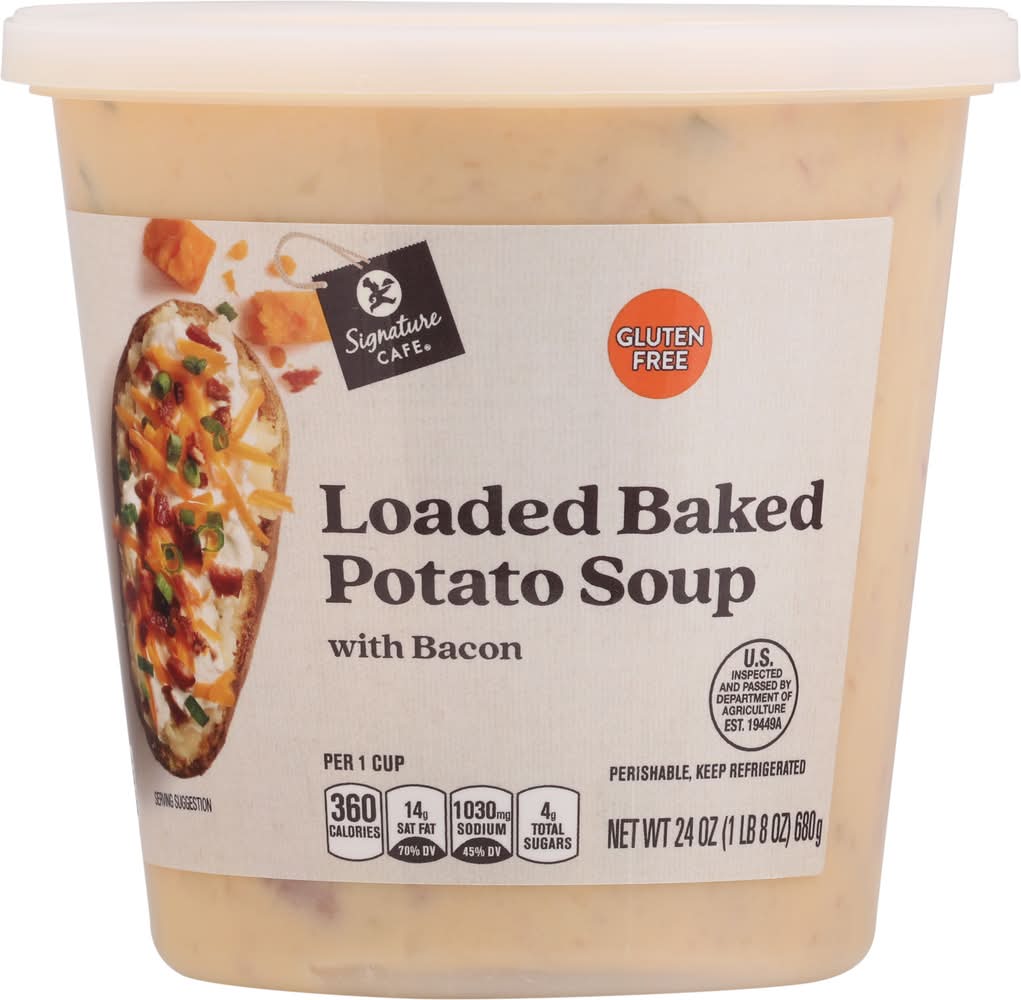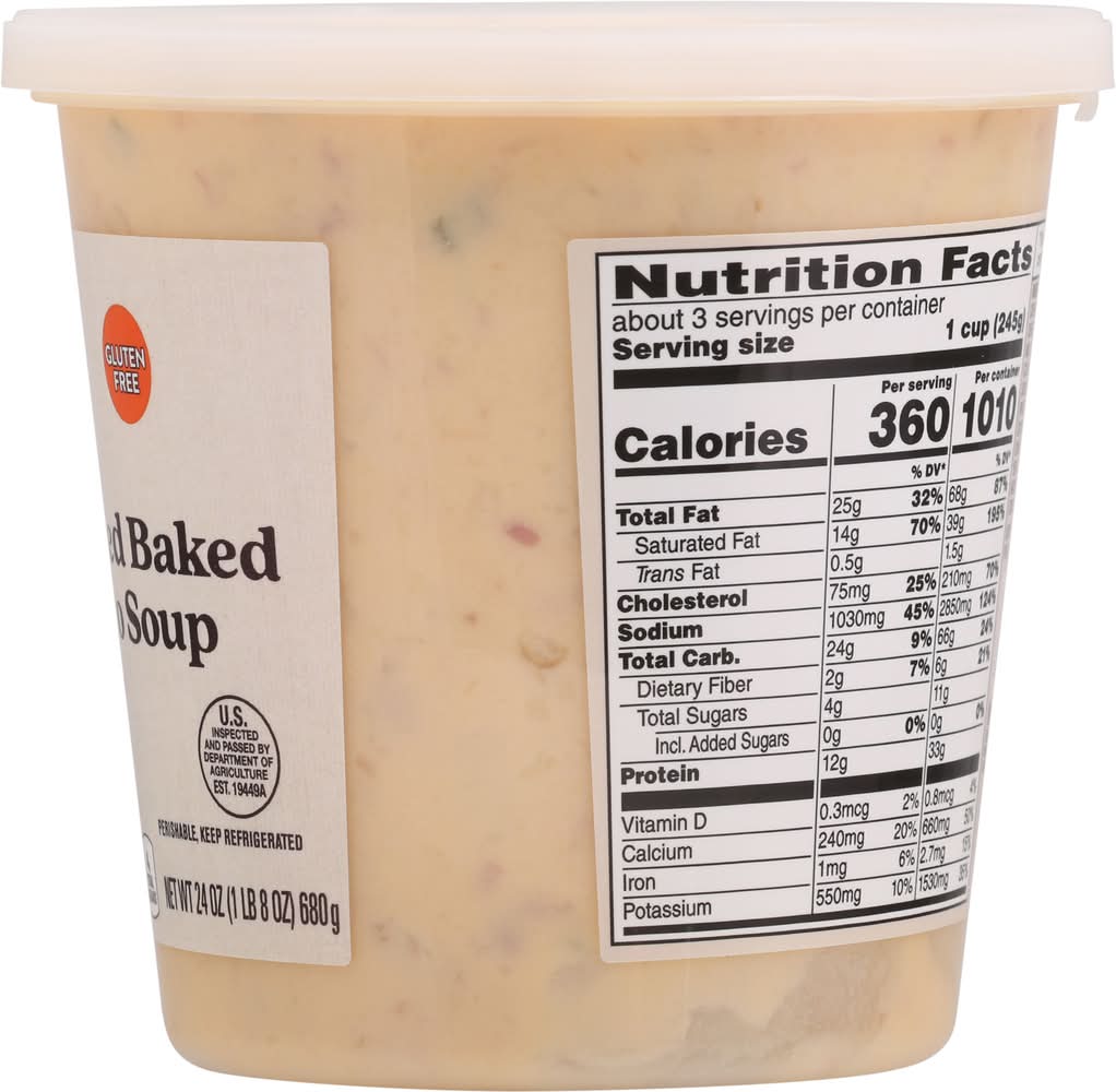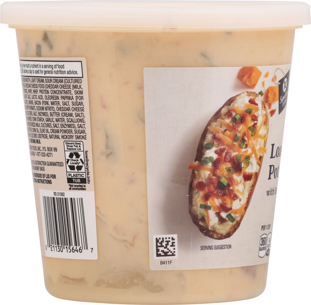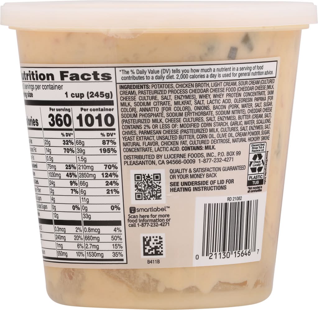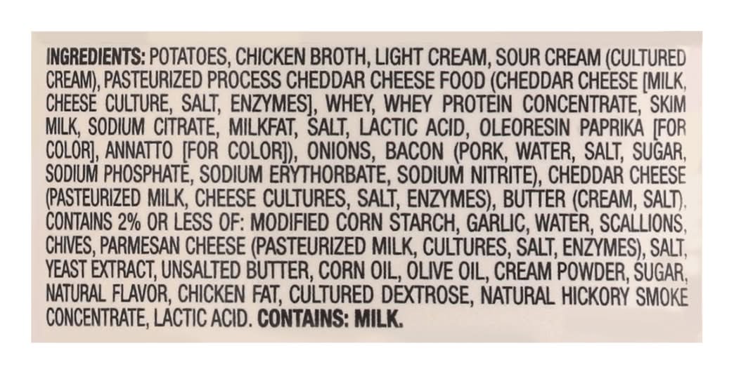 Ingredients: Potatoes, Chicken Broth, Light Cream, Sour Cream (Cultured Cream), Pasteurized Process Cheddar Cheese Food (Cheddar Cheese [Milk, Cheese Culture, Salt, Enzymes], Whey, Whey Protein Concentrate, Skim Milk, Sodium Citrate, Milkfat, Salt, Lactic Acid, Oleoresin Paprika [for Color], Annatto [for Color]), Onions, Bacon (Pork, Water, Salt, Sugar, Sodium Phosphate, Sodium Erythorbate, Sodium Nitrite), Cheddar Cheese (Pasteurized Milk, Cheese Cultures, Salt, Enzymes), Butter (Cream, Salt), Contains 2% or Less of: Modified Corn Starch, Garlic, Water, Scallions, Chives, Parmesan Cheese (Pasteurized Milk, Cultures, Salt, Enzymes), Salt, Yeast Extract, Unsalted Butter, Corn Oil, Olive Oil, Cream Powder, Sugar, Natural Flavor, Chicken Fat, Cultured Dextrose, Natural Hickory Smoke Concentrate, Lactic Acid. Contains: Milk