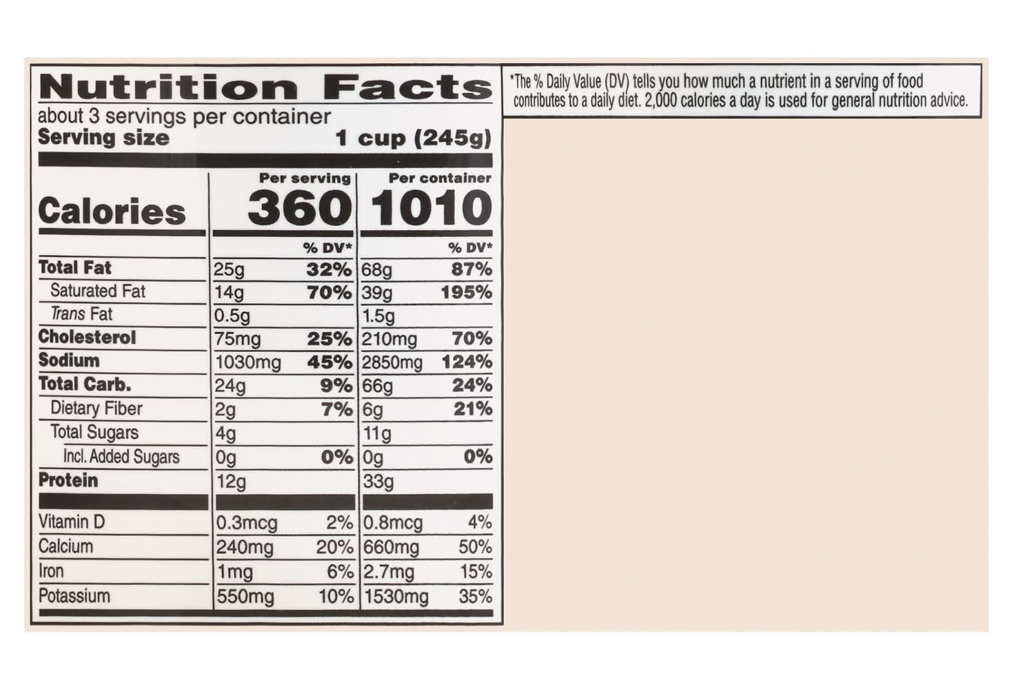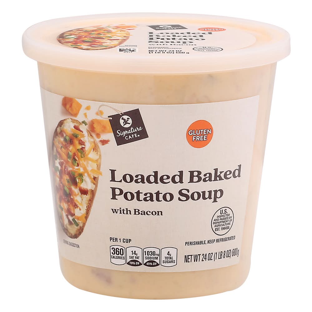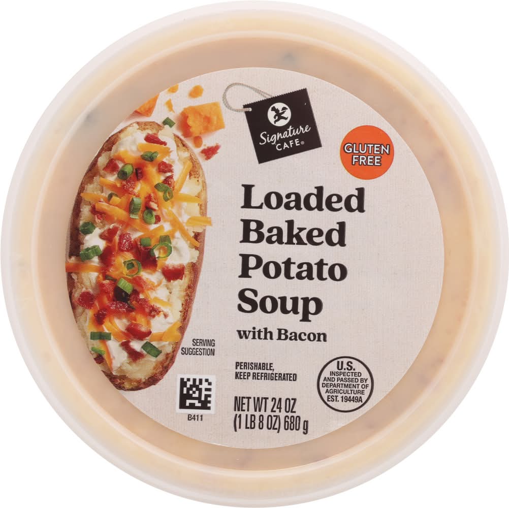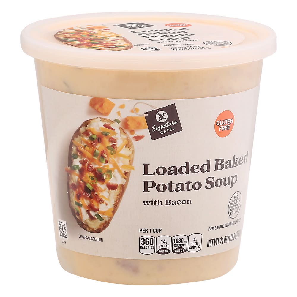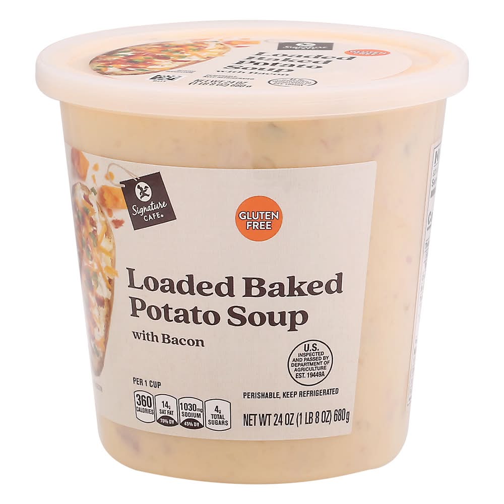 Ingredients: Potatoes, Chicken Broth, Light Cream, Sour Cream (Cultured Cream), Pasteurized Process Cheddar Cheese Food (Cheddar Cheese [Milk, Cheese Culture, Salt, Enzymes], Whey, Whey Protein Concentrate, Skim Milk, Sodium Citrate, Milkfat, Salt, Lactic Acid, Oleoresin Paprika [for Color], Annatto [for Color]), Onions, Bacon (Pork, Water, Salt, Sugar, Sodium Phosphate, Sodium Erythorbate, Sodium Nitrite), Cheddar Cheese (Pasteurized Milk, Cheese Cultures, Salt, Enzymes), Butter (Cream, Salt), Contains 2% or Less of: Modified Corn Starch, Garlic, Water, Scallions, Chives, Parmesan Cheese (Pasteurized Milk, Cultures, Salt, Enzymes), Salt, Yeast Extract, Unsalted Butter, Corn Oil, Olive Oil, Cream Powder, Sugar, Natural Flavor, Chicken Fat, Cultured Dextrose, Natural Hickory Smoke Concentrate, Lactic Acid. Contains: Milk