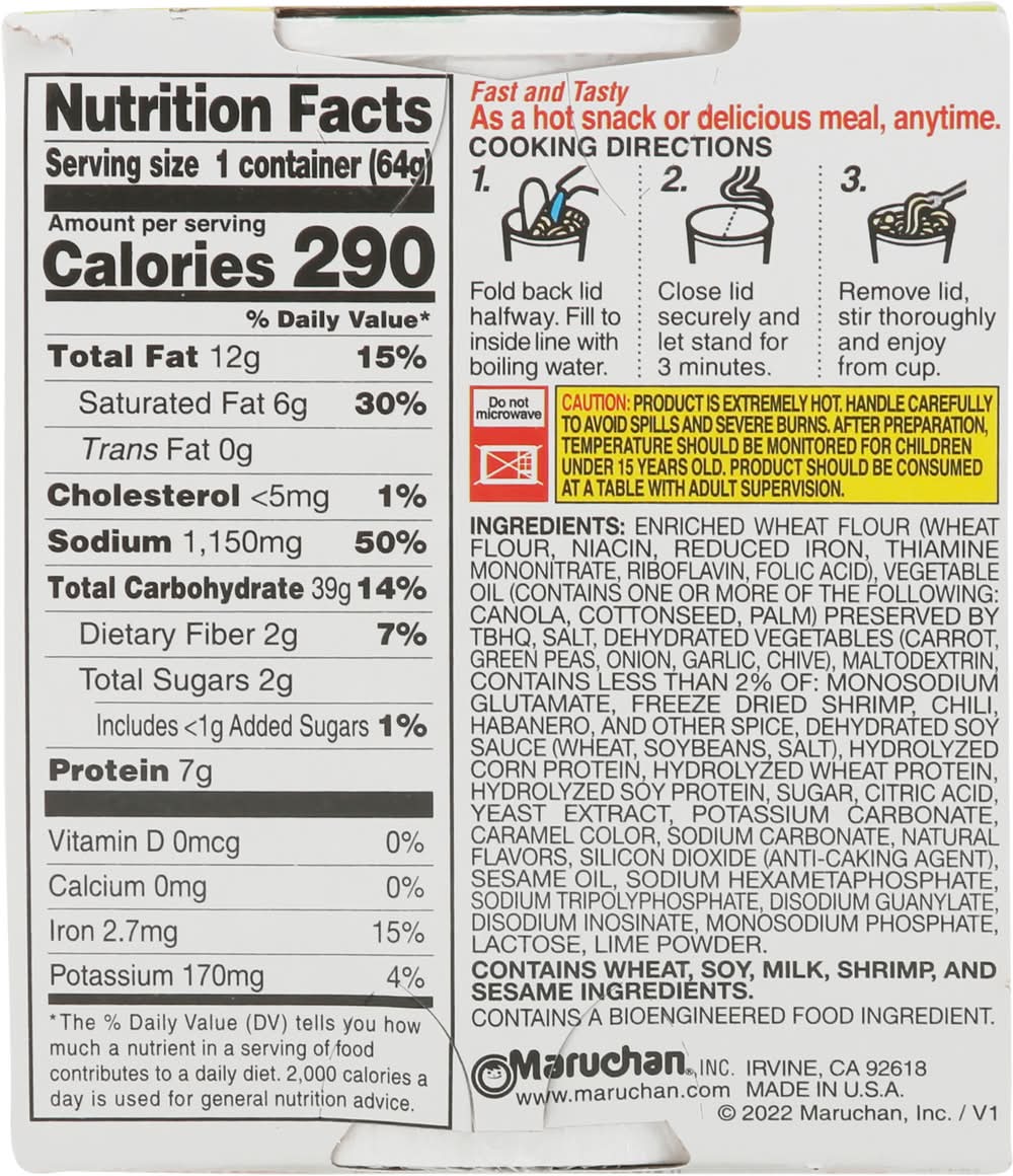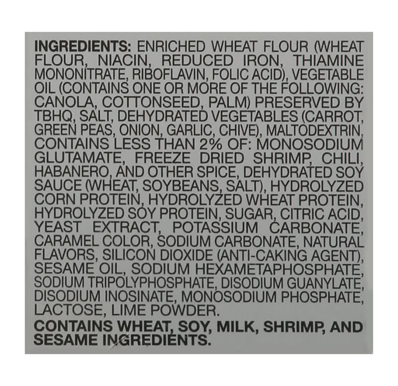 Ingredients: Enriched Wheat Flour (Wheat Flour, Niacin, Reduced Iron, Thiamine Mononitrate, Riboflavin, Folic Acid), Vegetable Oil (Contains One or More of the Following: Canola, Cottonseed, Palm) Preserved by TBHQ, Salt, Dehydrated Vegetables (Carrot, Green Peas, Onion, Garlic, Chive), Maltodextrin, Contains Less than 2% of: Monosodium Glutamate, Freeze Dried Shrimp Chili, Habanero, and Other Spice, Dehydrated Soy Sauce (Wheat, Soybeans, Salt), Hydrolyzed Corn Protein, Hydrolyzed Wheat Protein, Hydrolyzed Soy Protein, Sugar, Citric Acid, Yeast Extract, Potassium Carbonate, Caramel Color, Sodium Carbonate, Natural Flavors, Silicon Dioxide (Anti-Caking Agent), Sesame Oil, Sodium Hexametaphosphate, Sodium Tripolyphosphate, Disodium Guanylate, Disodium Inosinate, Monosodium Phosphate, Lactose, Lime Powder Contains: Wheat, Milk, Fish, Soybeans, Lactose