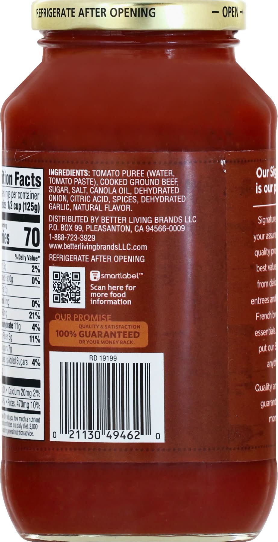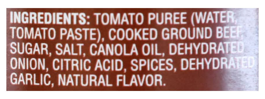 Ingredients: Tomato Puree, (Water, Tomato Paste), Cooked Ground Beef, Sugar, Salt, Canola Oil, Dehydrated Onion, Citric Acid, Spices, Dehydrated Garlic, Natural Flavor.
