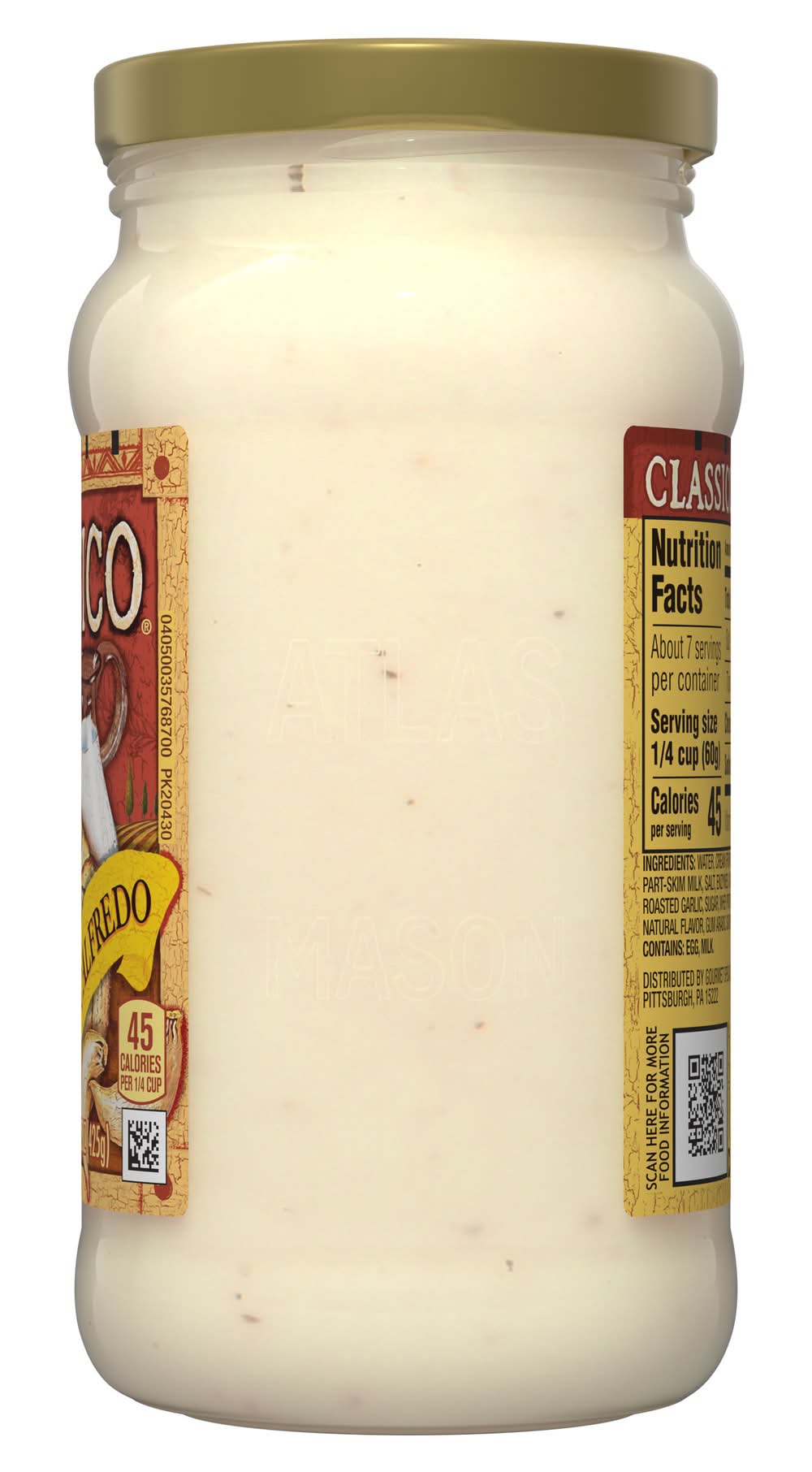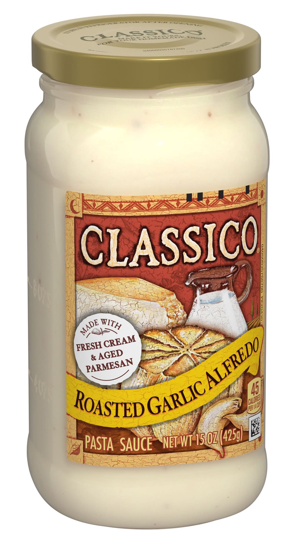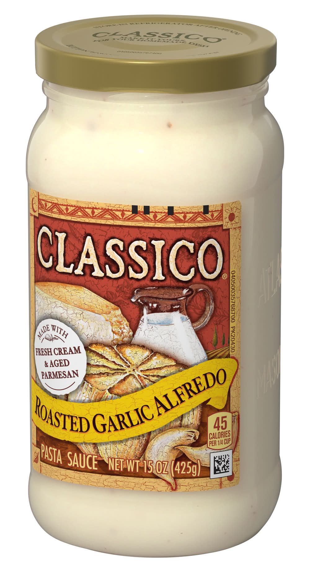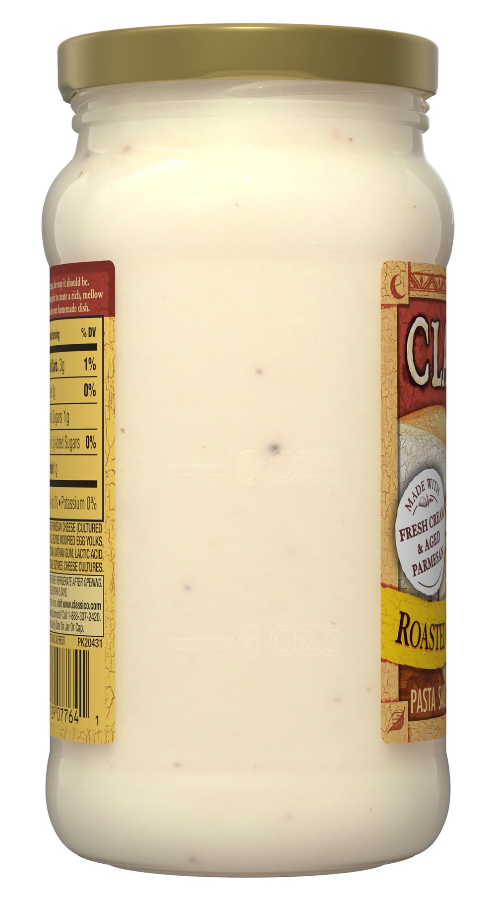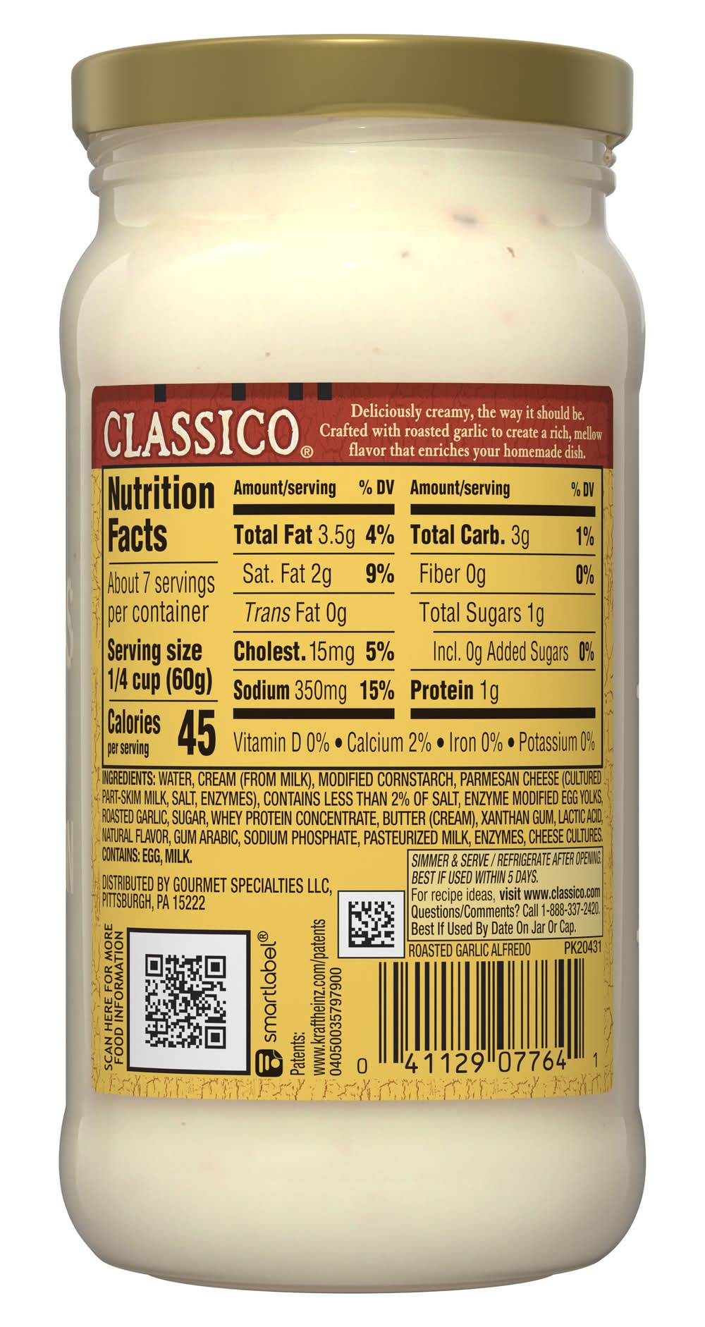 Ingredients: WATER, CREAM (FROM MILK), MODIFIED CORNSTARCH, PARMESAN CHEESE (CULTURED PART-SKIM MILK, SALT, ENZYMES), CONTAINS LESS THAN 2% OF SALT, ENZYME MODIFIED EGG YOLKS, ROASTED GARLIC, SUGAR, WHEY PROTEIN CONCENTRATE, BUTTER (CREAM), XANTHAN GUM, LACTIC ACID, NATURAL FLAVOR, GUM ARABIC, SODIUM PHOSPHATE, PASTEURIZED MILK, ENZYMES, CHEESE CULTURES. Contains: CONTAINS: EGG, MILK.