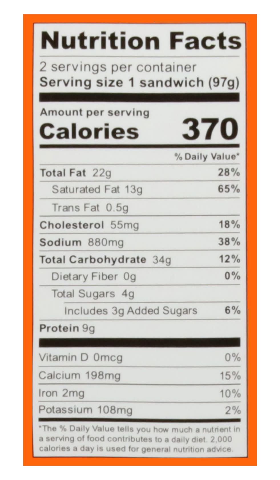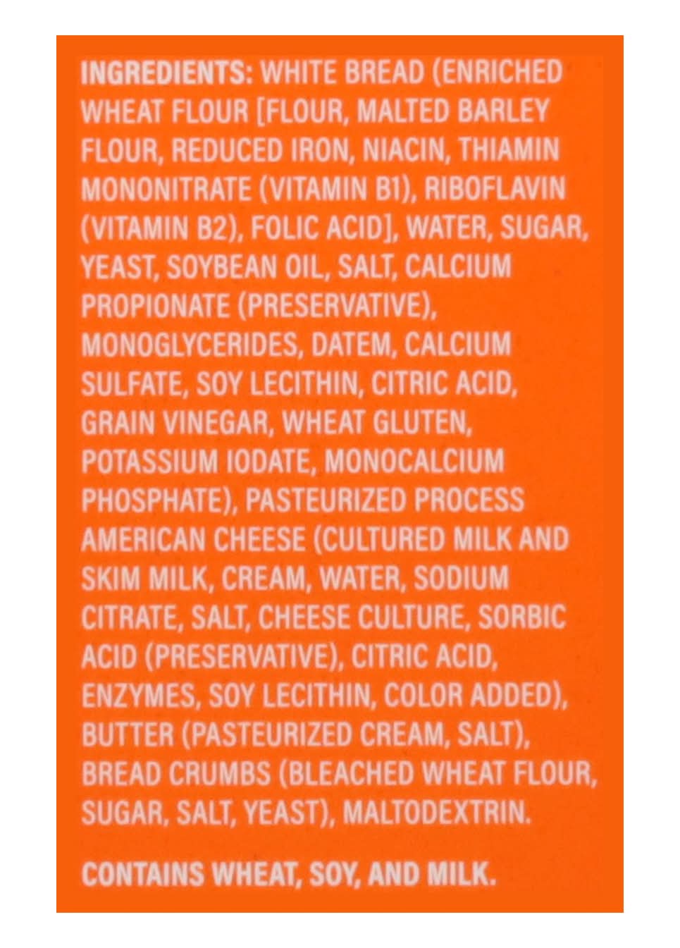 Ingredients: White Bread (Enriched Wheat Flour [Flour, Malted Barley Flour, Reduced Iron, Niacin, Thiamin Mononitrate (Vitamin B1), Riboflavin (Vitamin B2), Folic Acid], Water, Sugar, Yeast, Soybean Oil, Salt, Calcium Propionate (Preservative), Monoglycerides, DATEM, Calcium Sulfate, Soy Lecithin, Citric Acid, Grain Vinegar, Wheat Gluten, Potassium Iodate, Monocalcium Phosphate), Pasteurized Process American Cheese (Cultured Milk and Skim Milk, Cream, Water, Sodium Citrate, Salt, Cheese Culture, Sorbic Acid (Preservative), Citric Acid, Enzymes, Soy Lecithin, Color Added), Butter (Pasteurized Cream, Salt), Bread Crumbs (Bleached Wheat Flour, Sugar, Salt, Yeast), Maltodextrin Contains: Wheat, Soybeans, Milk, Barley, Gluten