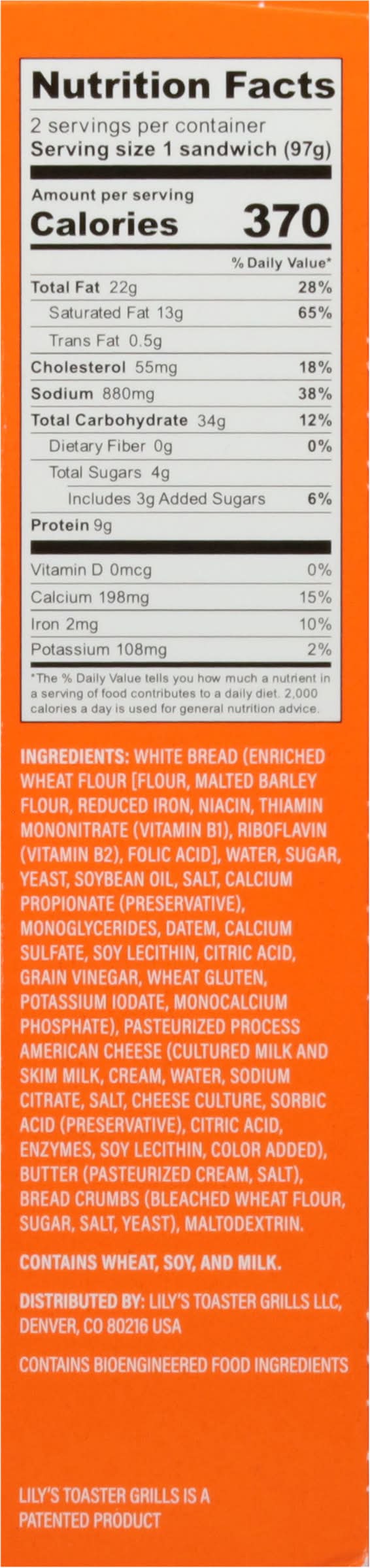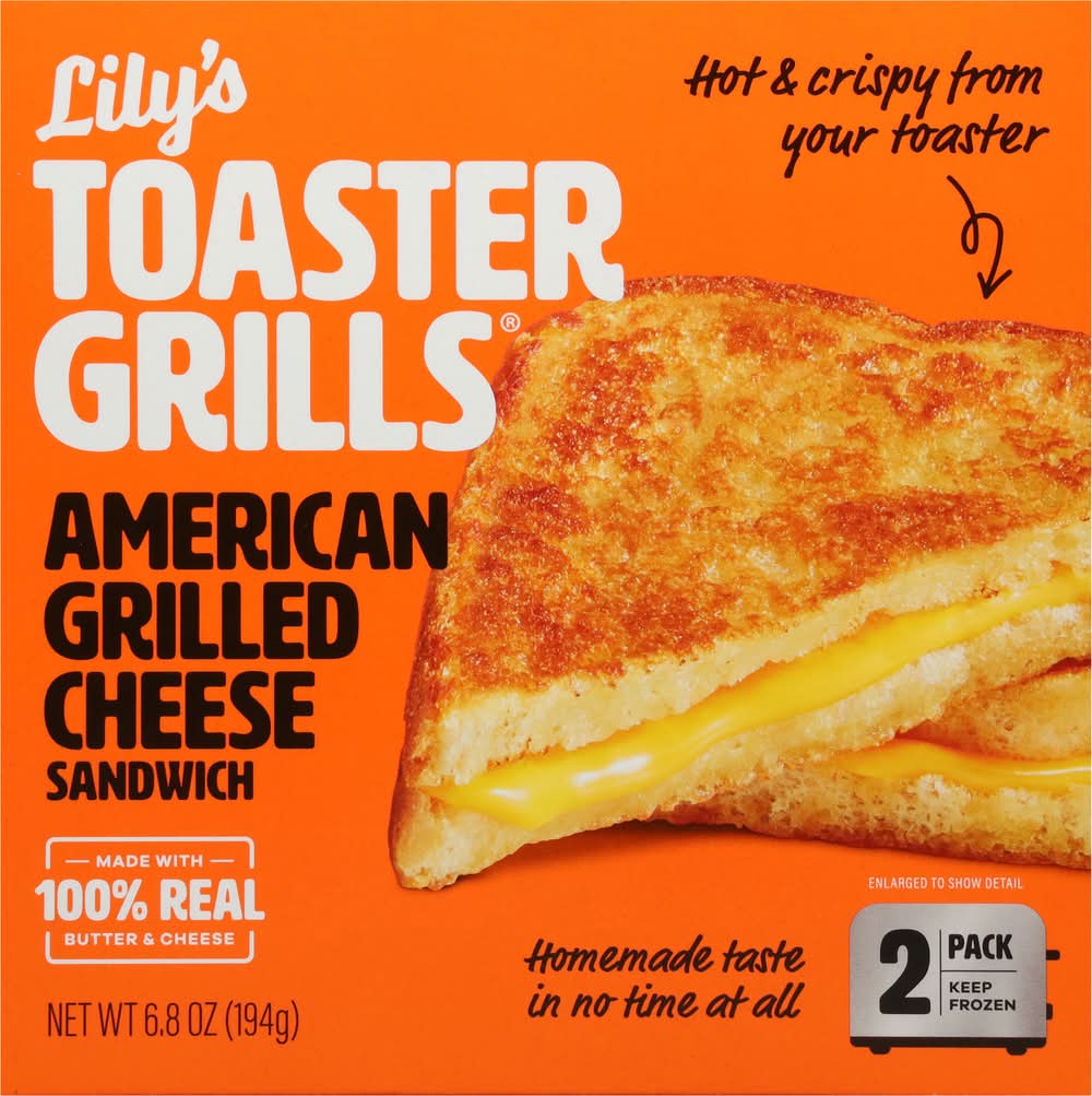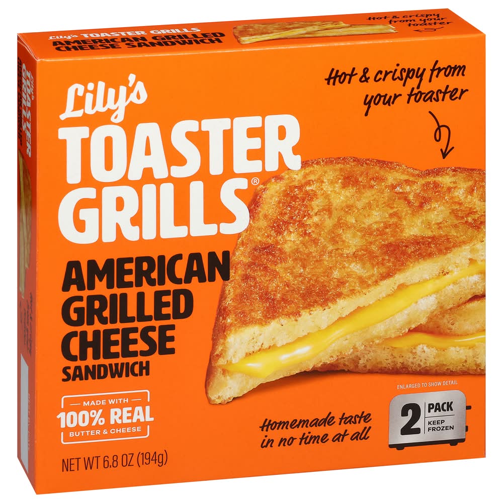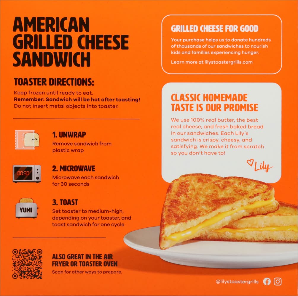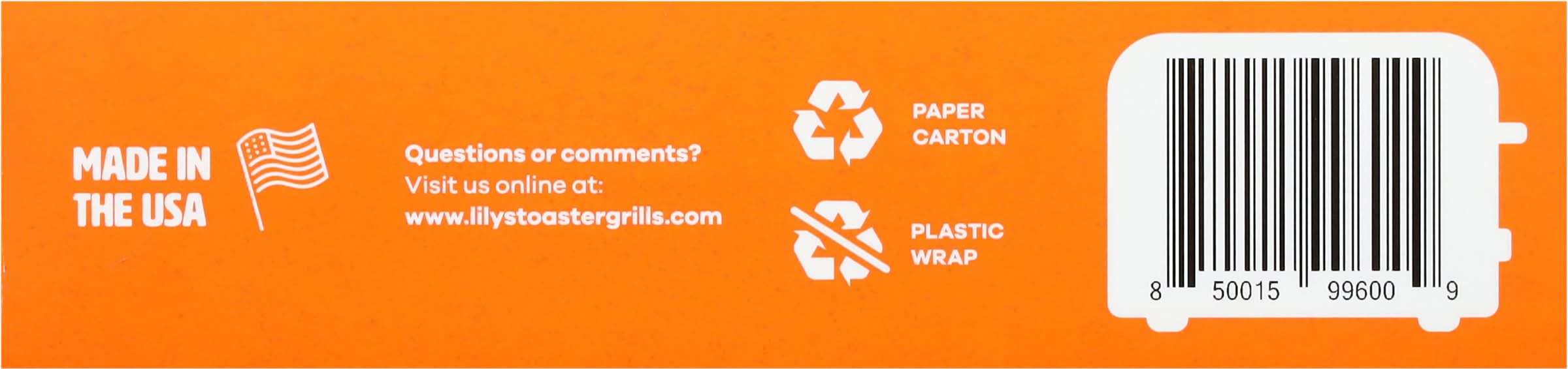 Melted American cheese between two slices of crispy, buttered bread. Hot and crispy straight from your toaster: Perfectly crispy and gooey every time. Tastes just like Mom’s No prep with no mess: We’ve done the hard work, so you don’t have to – you won’t need ingredients, a hot stove, a buttered pan, the time to cook or clean-up. Plus, this won’t leak out the sides or make a mess in the toaster. All real ingredients: Made with real butter, real cheese and real bread Lily’s helps to feed the hungry: Lily’s Toaster Grills donates hundreds of thousands of sandwiches every year to feed kids experiencing hunger. Every sandwich you buy and enjoy enables us to “spread the love” to those who need it most. Packaging: Reusable