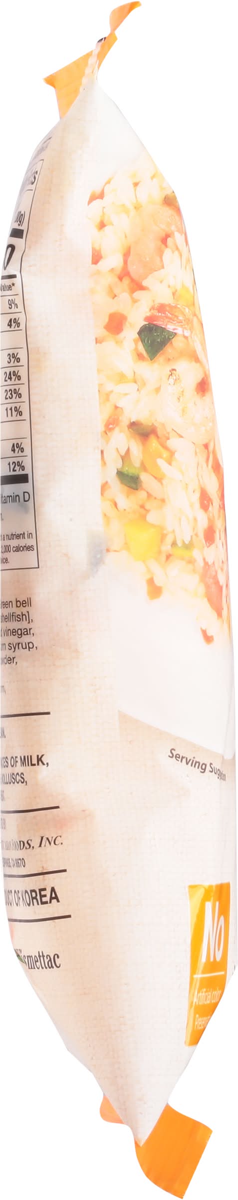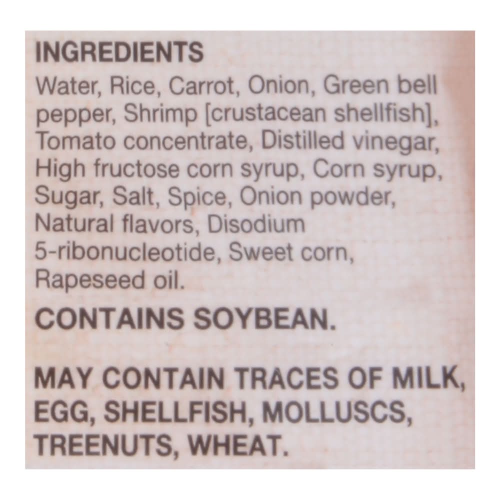 Ingredients: Water, Rice, Carrot, Onion, Green Bell Pepper, Shrimp [Crustacean Shellfish), Tomato Concentrate, Distilled Vinegar, High Fructose Corn Syrup, Corn Syrup, Sugar, Salt, Spice, Onion Powder, Natural Flavors, Disodium 5-Ribonucleotide, Sweet Corn, Rapeseed Oil Contains: Soybeans, Crustacean Shellfish, Shrimp, Crustacean Shellfish, Corn, Milk, Eggs, Crustacean Shellfish, Molluscan Shellfish, Tree Nuts, Wheat