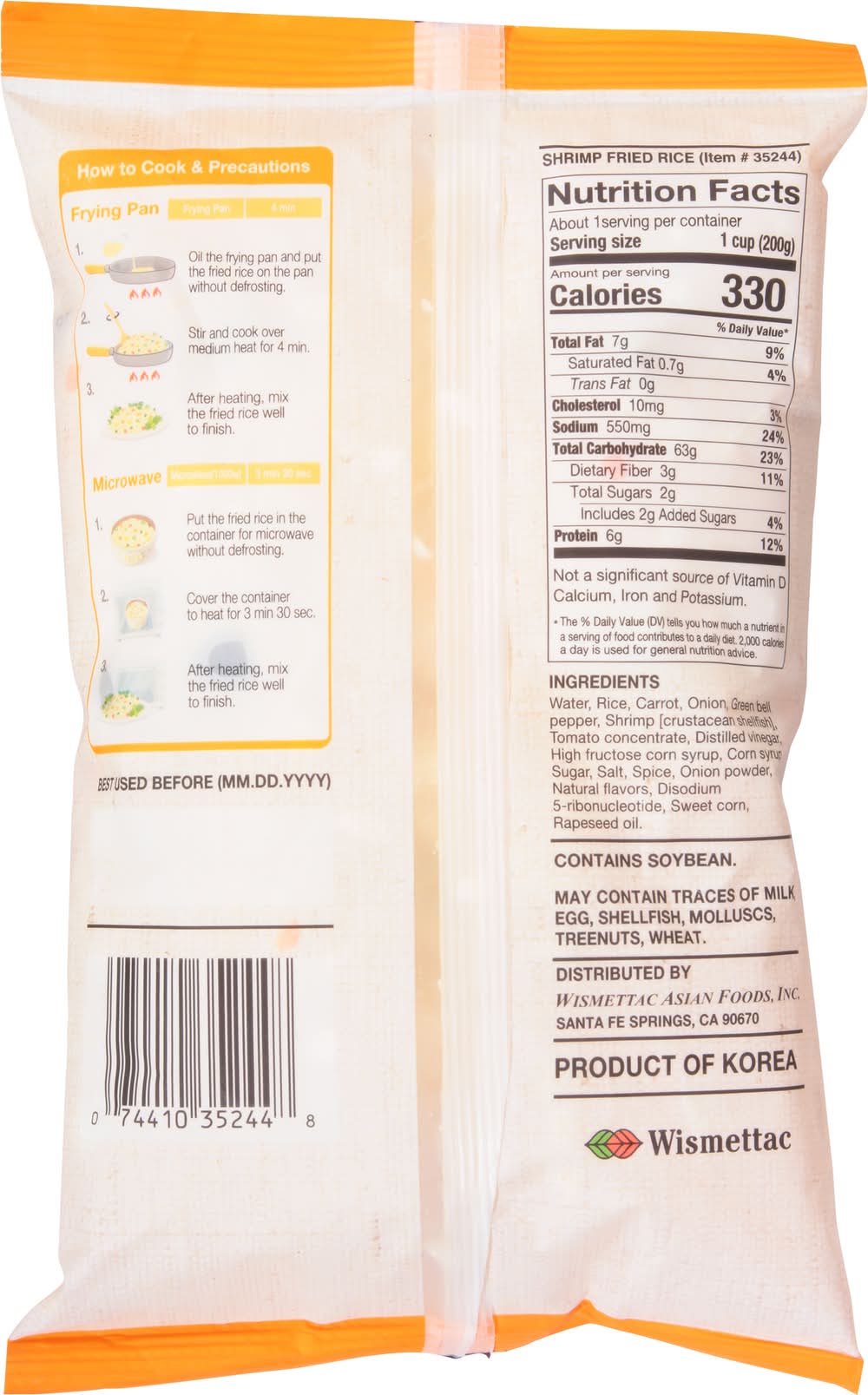 Directions for use: Pan Fry: Frying Pan: 4 min: 1. Oil the frying pan and put the fried rice on the pan without defrosting. 2. Stir and cook over medium heat for 4 min. 3. After heating, mix the fried rice well to finish. Microwave: Microwave: Microwave (1000w): 3 min 30 sec. 1. Put the fried rice in the container for microwave without defrosting. 2. Cover the container to heat for 3 min 30 sec. 3. After heating, mix the fried rice well to finish. How to Cook & Precautions: Keep frozen. Best used before (MM.DD.YYYY). Storage recommendation: Keep frozen.