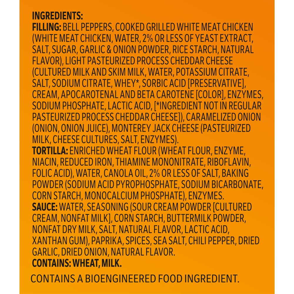 Ingredients: FILLING: BELL PEPPERS, COOKED GRILLED WHITE MEAT CHICKEN (WHITE MEAT CHICKEN, WATER, 2% OR LESS OF YEAST EXTRACT, SALT, SUGAR, GARLIC ONION POWDER, RICE STARCH, NATURAL FLAVOR), LIGHT PASTEURIZED PROCESS CHEDDAR CHEESE (CULTURED MILK AND SKIM MILK, WATER, POTASSIUM CITRATE, SALT, SODIUM CITRATE, WHEY*, SORBIC ACID [PRESERVATIVE], CREAM, APOCAROTENAL AND BETA CAROTENE [COLOR], ENZYMES, SODIUM PHOSPHATE, LACTIC ACID, [*INGREDIENT NOT IN REGULAR PASTEURIZED PROCESS CHEDDAR CHEESE]), CARAMELIZED ONION (ONION, ONION JUICE), MONTEREY JACK CHEESE (PASTEURIZED MILK, CHEESE CULTURES, SALT, ENZYMES), . TORTILLA: ENRICHED WHEAT FLOUR (WHEAT FLOUR, ENZYME, NIACIN, REDUCED IRON, THIAMINE MONONITRATE, RIBOFLAVIN, FOLIC ACID), WATER, CANOLA OIL, 2% OR LESS OF SALT, BAKING POWDER (SODIUM ACID PYROPHOSPHATE, SODIUM BICARBONATE, CORN STARCH, MONOCALCIUM PHOSPHATE), ENZYMES. SAUCE: WATER, SEASONING (SOUR CREAM POWDER [CULTURED CREAM, NONFAT MILK], CORN STARCH, BUTTERMILK POWDER, NONFAT DRY MILK, SALT, NATURAL FLAVOR, LACTIC ACID, XANTHAN GUM), PAPRIKA, SPICES, SEA SALT, CHILI PEPPER, DRIED GARLIC, DRIED ONION, NATURAL FLAVOR. Contains: CONTAINS: WHEAT, MILK. Additives: Genetically Modified Ingredients
