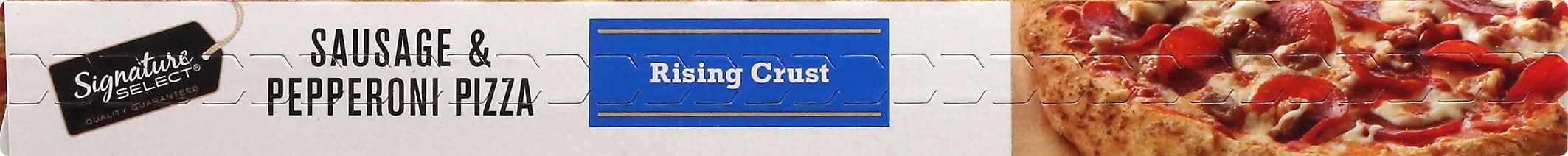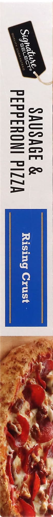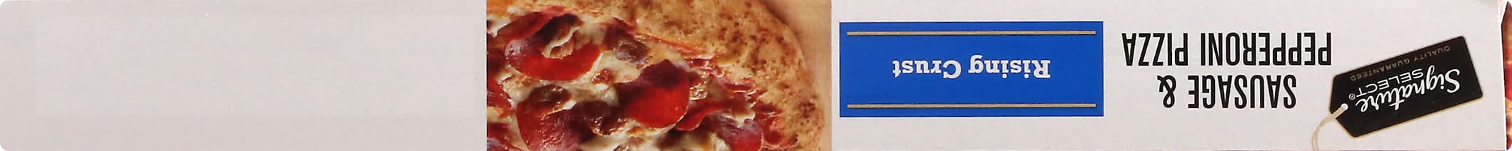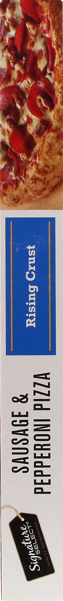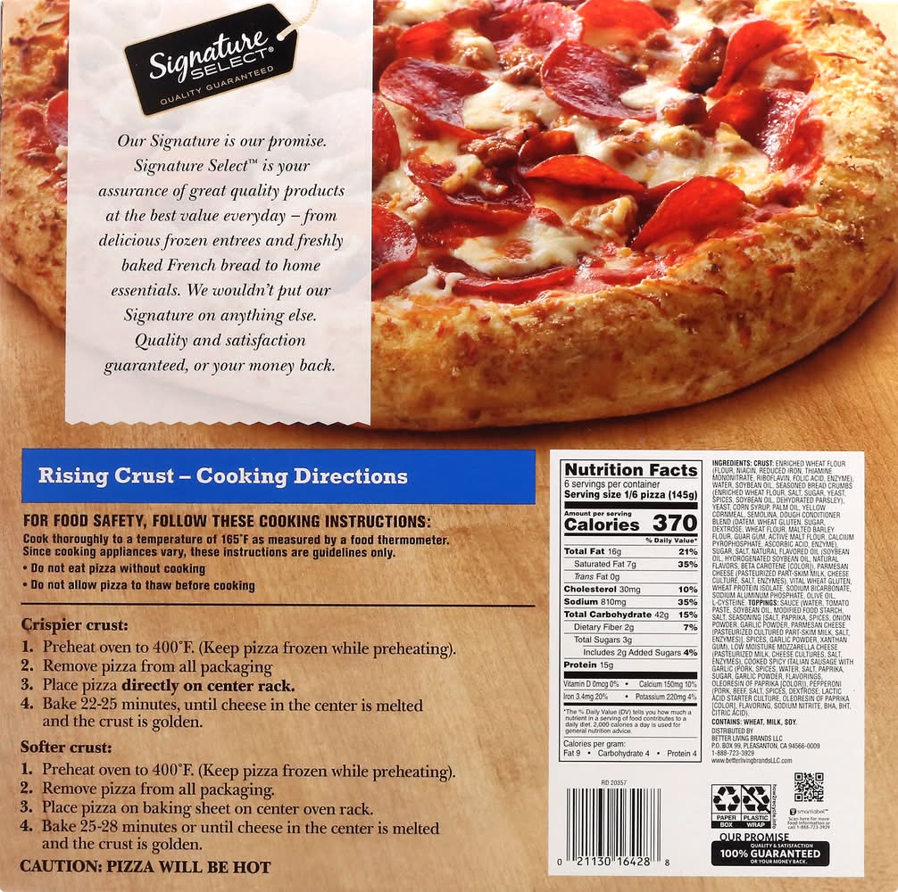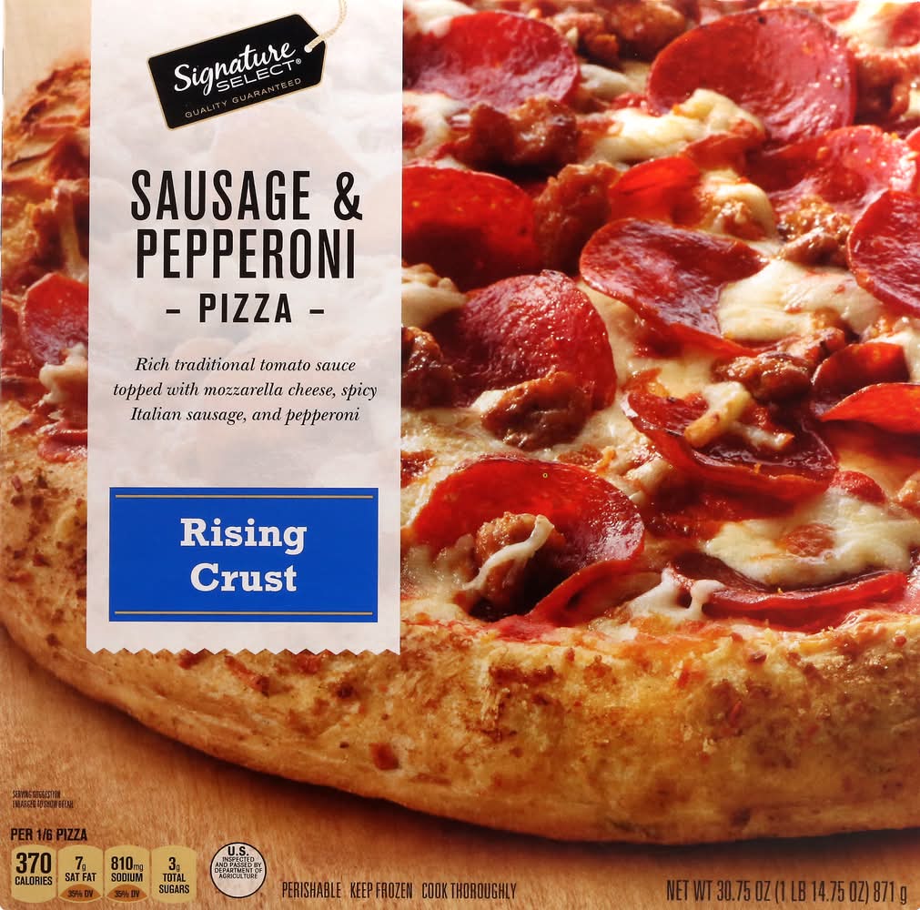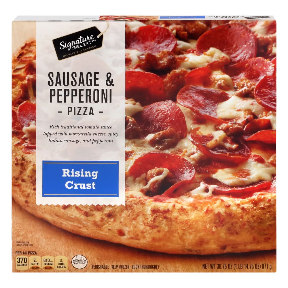 Rich traditional tomato sauce topped with mozzarella cheese, spicy Italian sausage, and pepperoni. Per 1/6 Pizza: 370 calories; 7 g sat fat (35% DV); 810 mg sodium (35% DV); 3 g total sugars. Quality guaranteed. Our Signature is our Promise: Signature Select is your assurance of great quality products at the best value every day. • Number of servings: 6 • Better Living Brands LLC, Pleasanton, CA, 94566-0009, Ph: 888-723-3929 • Packaging: Reusable