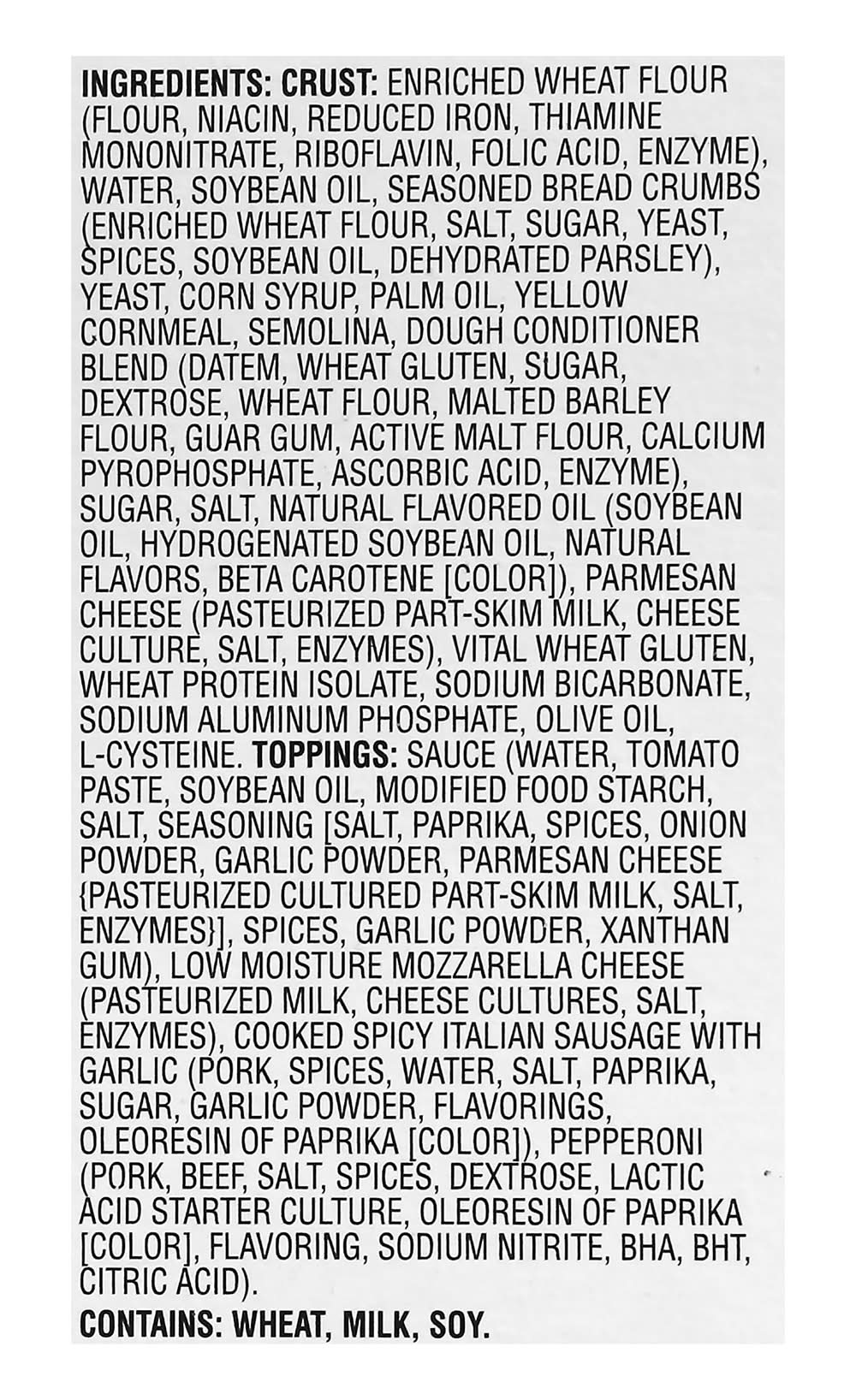 Ingredients: Crust: Enriched Wheat Flour (Flour, Niacin, Reduced Iron, Thiamine Mononitrate, Riboflavin, Folic Acid, Enzyme), Water, Soybean Oil, Seasoned Bread Crumbs (Enriched Wheat Flour, Salt, Sugar, Yeast, Spices, Soybean Oil, Dehydrated Parsley), Yeast, Corn Syrup, Palm Oil, Yellow Cornmeal, Semolina, Dough Conditioner Blend (DATEM, Wheat Gluten, Sugar, Dextrose, Wheat Flour, Malted Barley Flour, Guar Gum, Active Malt Flour, Calcium Pyrophosphate, Ascorbic Acid, Enzyme), Sugar, Salt, Natural Flavored Oil (Soybean Oil, Hydrogenated Soybean Oil, Natural Flavors, Beta Carotene [Color]), Parmesan Cheese (Pasteurized Part-Skim Milk, Cheese Culture, Salt, Enzymes), Vital Wheat Gluten, Wheat Protein Isolate, Sodium Bicarbonate, Sodium Aluminum Phosphate, Olive Oil, L-Cysteine. Toppings: Sauce (Water, Tomato Paste, Soybean Oil, Modified Food Starch, Salt, Seasoning [Salt, Paprika, Spices, Onion Powder, Garlic Powder, Parmesan Cheese {Pasteurized Cultured Part-Skim Milk, Salt, Enzymes}], Spices, Garlic Powder, Xanthan Gum), Low Moisture Mozzarella Cheese (Pasteurized Milk, Cheese Cultures, Salt, Enzymes), Cooked Spicy Italian Sausage with Garlic (Pork, Spices, Water, Salt, Paprika, Sugar, Garlic Powder, Flavorings, Oleoresin of Paprika [Color]), Pepperoni (Pork, Beef, Salt, Spices, Dextrose, Lactic Acid Starter Culture, Oleoresin of Paprika [Color], Flavoring, Sodium Nitrite, BHA, BHT, Citric Acid). Contains: Wheat, Soybeans, Gluten, Milk